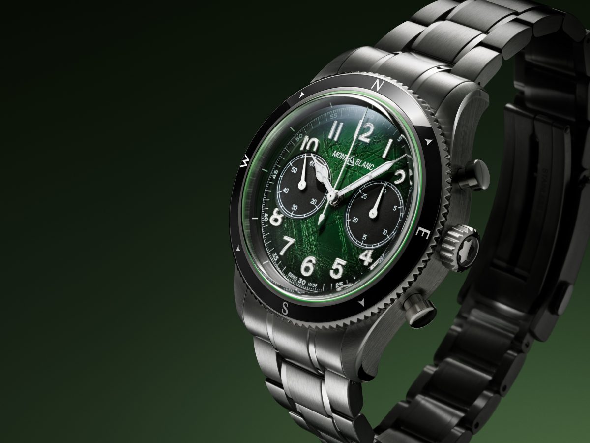 1858系列自動計時零氧腕錶配備42公釐無氧精鋼錶殼,搭載MB 25.13 自動上鍊計時機芯,提供48小時動力儲存。綠色暈染錶盤設有兩個計時盤:9點鐘位置為黑色小秒盤,3點鐘位置為黑色30分鐘計時盤。計時秒數由中央秒針指示。為呼應子錶盤的設計,配備黑色雙向旋轉陶瓷錶圈,飾有夜光羅盤方位。腕錶隨附可替換的精鋼錶鍊,採用梯形設計並附有微調系統。錶背飾有白朗峰山脈、羅盤方位和兩把交叉的冰斧。