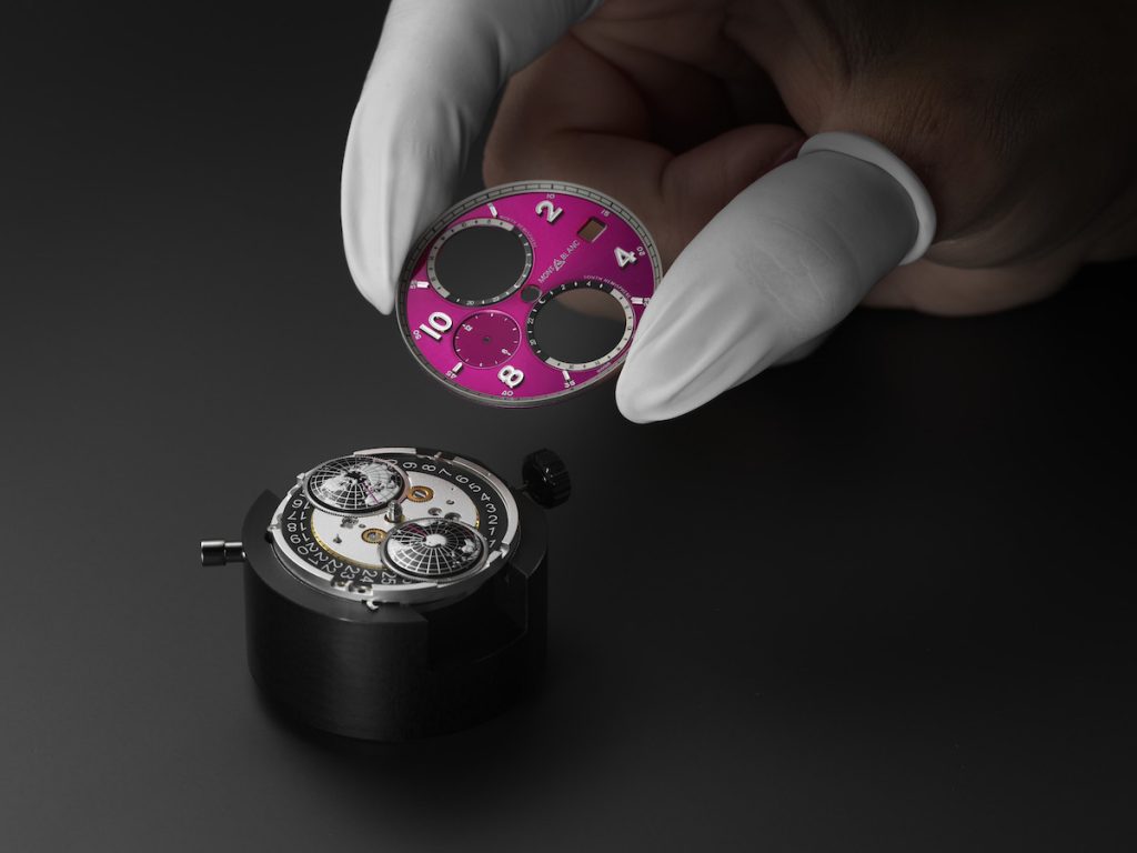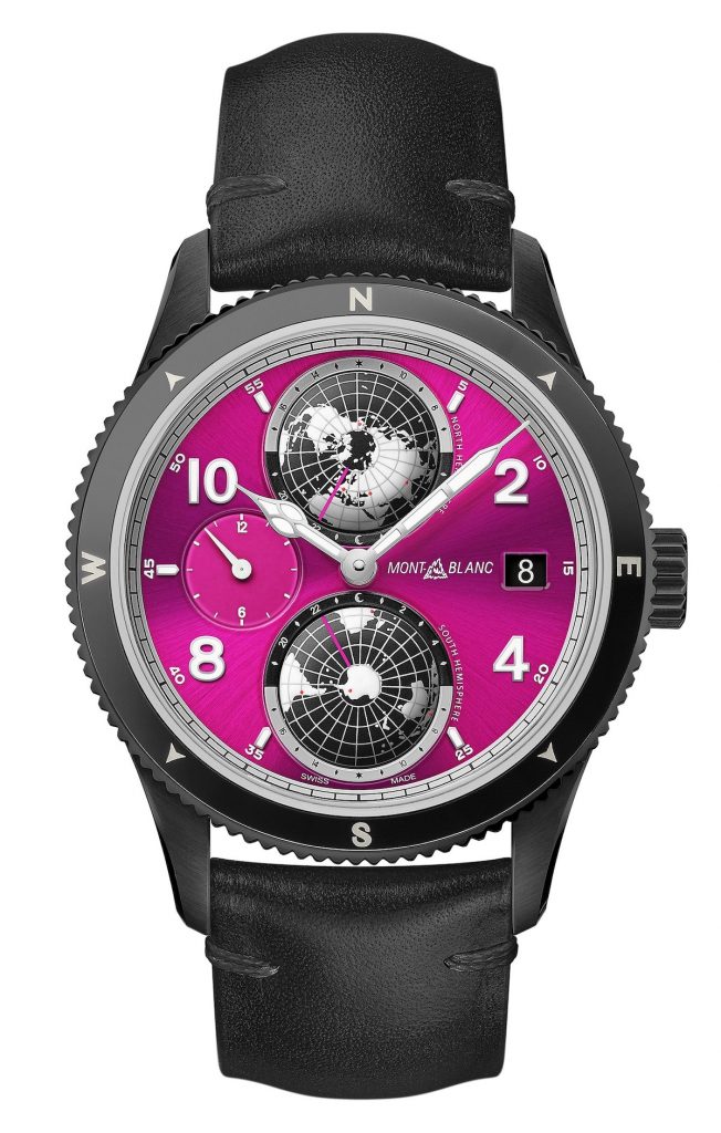 萬寶龍設計師以象徵乳癌防治的粉紅色為靈感來源,選用絢麗的亮紫紅色錶盤,並塗覆放射狀太陽紋,使腕錶更加突出亮眼。錶圈上的指南針標示、阿拉伯數字、時標與半球體均塗覆SuperLuminova®夜光塗層,散發藍色冷光,而時針、分針和第二時區則散發綠色冷光,營造出一種迷人的光彩美學,並提升時間讀取清晰度。