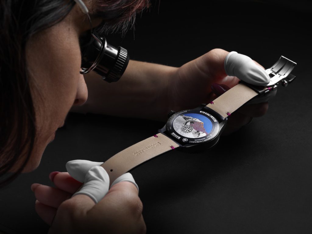 1858系列Geosphere腕錶的設計靈感源自於白朗峰在內之世界七頂峰的攀登挑戰,並在旋轉式南、北半球球體上以點狀標誌標示出七頂峰,其名稱則鐫刻於錶背。為了致敬粉紅錶盤計畫,腕錶的背面飾以正對著知名白朗峰所反射的粉紅色日落3D渲染圖案,逼真的效果採用極為特殊的雷射雕刻技術,看起來猶如一張照片。製作如此精細生動的圖案,首先要在鈦金屬錶殼上採用雷射雕刻出紋飾層次,同時須考量其浮雕效果。接著,同樣以雷射雕刻打造出所想要的表面效果(啞光或亮面)。最後為上色階段,在雷射生成的氧化作用下,隨著氧化程度的不同而呈現出各種顏色。萬寶龍是率先將此技術運用在大範圍表面的先進瑞士品牌之一,這項創新也符合了品牌的探索精神。