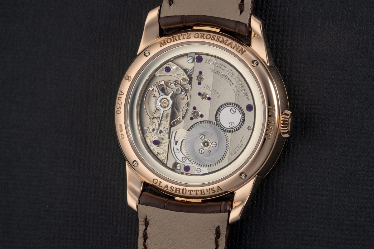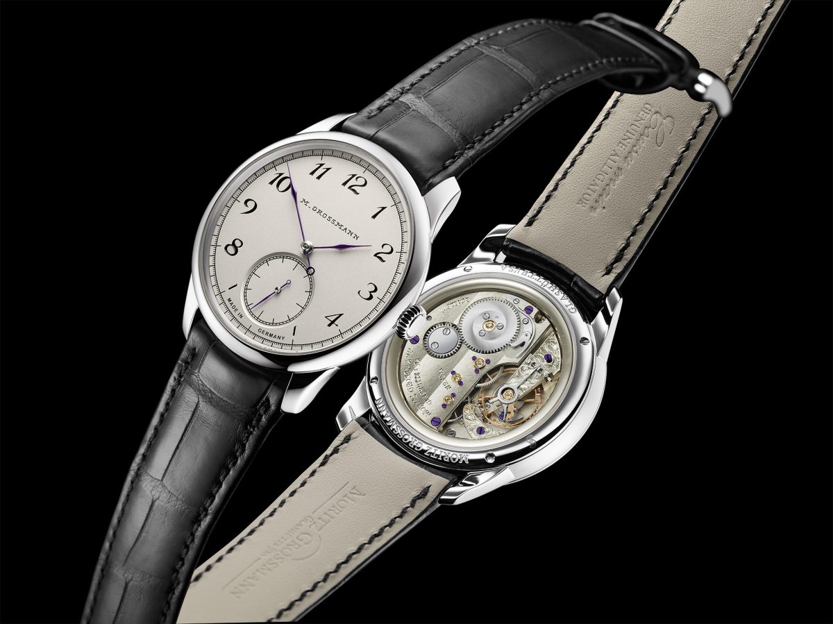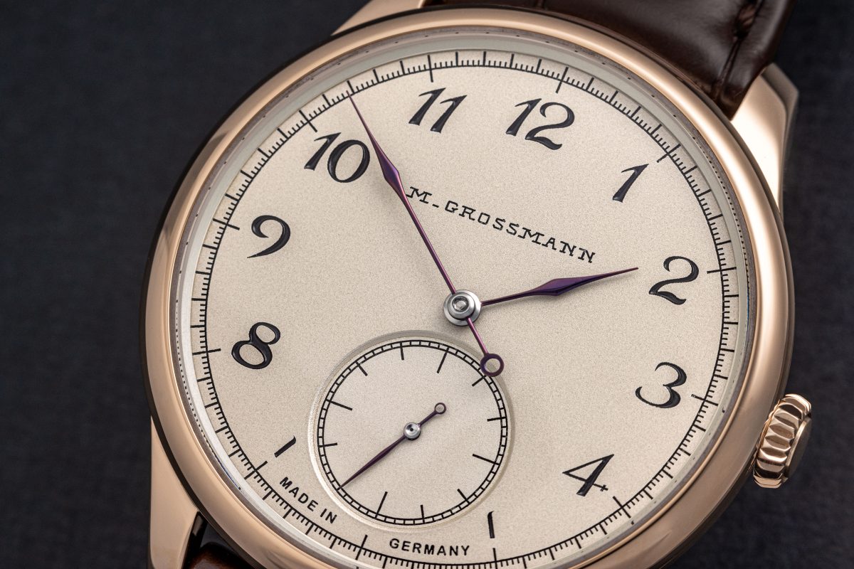 錶盤表面與黑色時標形成鮮明的對比:所有陰刻後的數字、刻度和 1875 年的經典標誌「M. Grossmann」皆塗上黑漆,然後將錶盤放入烤爐燒製,由於銀粉不會附著在漆面上,塗漆表面不會產生拭銀效果。面盤時標數字弧線精美,與紫棕色指針相得益彰,這些都是經過無數手工精心打造步驟的藝術成果,視覺柔和圓潤,令人著迷。