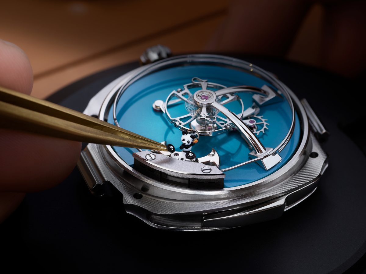 它的轉盤安裝在音錘的軸上,隨著機芯的運轉而旋轉。迷你熊貓的高度僅5.35毫米,從設計和開發階段開始,經過建模、製造,然後由雕刻師手工打磨,再經過珠寶匠的最後拋光,每一步都需要耗費無數小時的精密工作,更不用提還有細緻的繪畫工藝。由於其零件非常微小,例如0.99毫米的口鼻部位,以及帶有爪印的轉盤,外徑為1.75毫米,厚度僅為0.35毫米,堪稱不折不扣的技術和藝術壯舉。