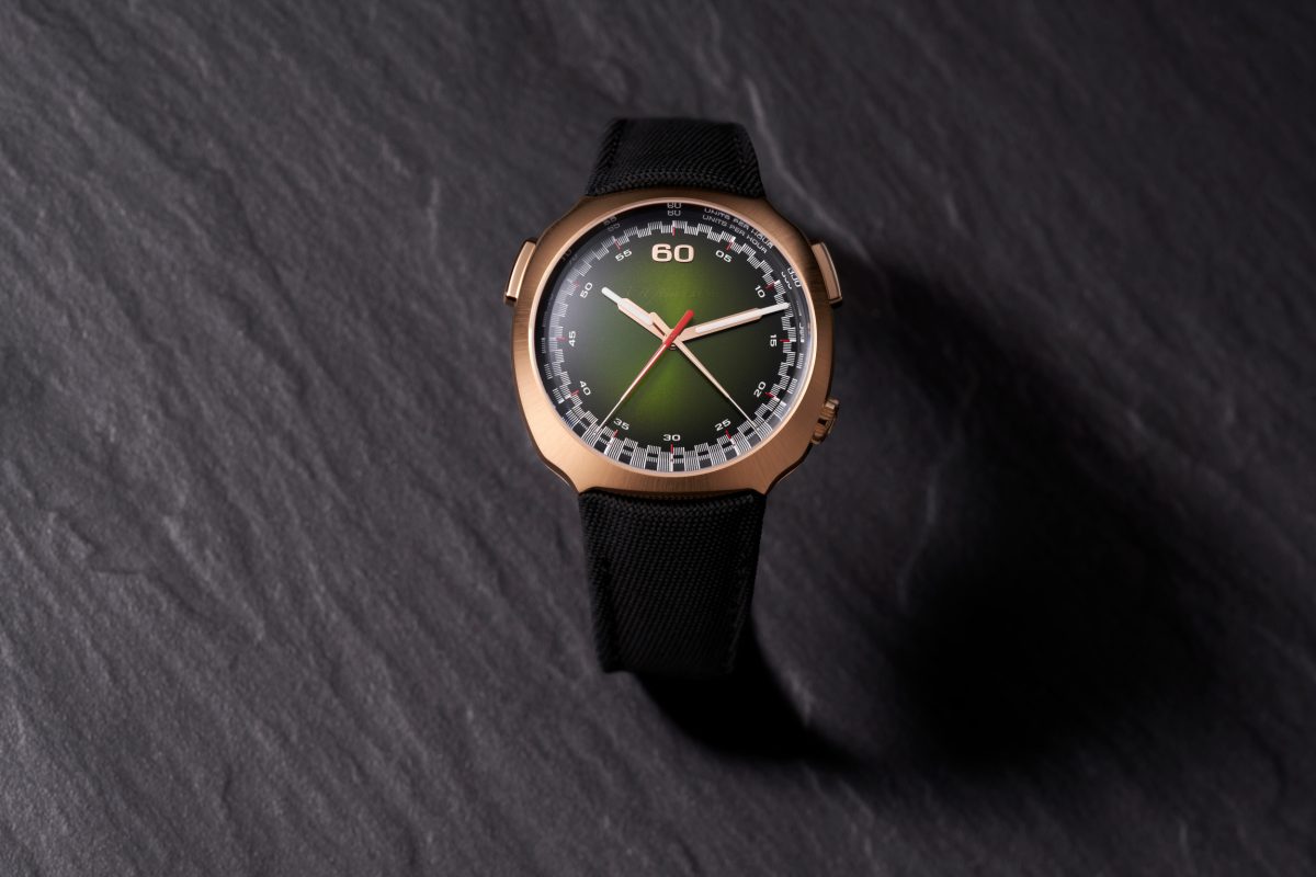 紅色及白色刻度環繞極光綠錶盤邊緣,外側軌道測量秒數,內側軌道計算分鐘數。12時位置的立體60數字成為盤的視覺焦點,令人回想起1960年代和1970年代以易讀性和功能性為關鍵的碼錶。精準測量過去時間的極細指針帶有厚實的底部和細薄的尖端,與車內儀表板或測量儀器互相呼應。亨利慕時向來著重於識讀性,因此特別選用紅色秒針。製錶廠選擇由兩個部分組成的3D立體鍍金弧形指針指示小時及分鐘,並嵌入含有Super-LumiNova®夜光物料的創新陶瓷基底材質Globolight®。