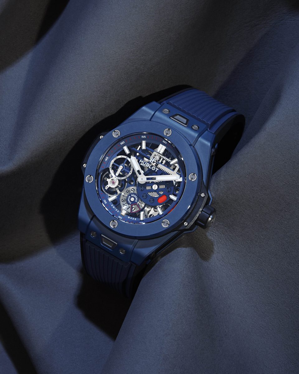這款腕錶融合了創新的設計和先進的技術,採用自製 Meca-10 (HUB1201)手上鍊機芯,搭載兩枚並聯發條盒,提供十日長達240小時的動力儲備。獨特的齒軌系統連結動力儲能指示,另有 King Gold 皇金款,鈦金屬款,及魔力黑陶瓷款,極具特殊風格的工業風造型,將機芯之美完全展現。