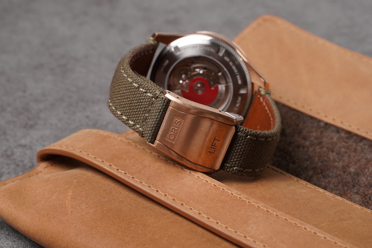 這是一款高性能的飛行腕錶,因此指針的螢光採用白色Super LumiNova,和實心的Super LumiNova立體時標,帶來對比度外也擁有絕佳的判讀性。耐磨的綠色Ventile錶帶搭配Oris專利的「Lift」青銅折疊錶扣,開發靈感來自飛機的安全帶帶扣,為腕錶注入飛行巧思。