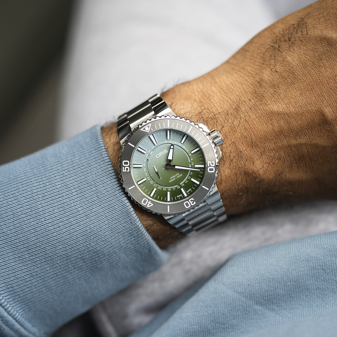 以Aquis系列推出的Oris X Bracenet腕錶,美麗且獨一無二的紋路面盤,即是將幽靈漁網回收再造製成,將小塊的綠、藍與白色材料慢慢加熱,直到融化後冷卻,它們將結成薄片材料,然後經過切割與打磨成厚度為0.3mm的材料,過程無添加物、填料或膠材。不只是以行動力挺海洋保育,更傳達著一項宣言:人類必須改變。