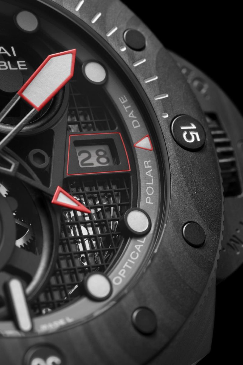 全新沛納海Submersible S BRABUS Black Ops專業潛水腕錶 (PAM01240) 巧妙演繹Brabus標誌性的槍灰色、黑色和紅色配色。為致敬兩個品牌對創新高端複合材質的一貫熱情,新款腕錶的錶殼以極富現代感的深灰色Carbotech™碳纖維材質製成,時針、分針和小秒針均點綴醒目的Brabus紅色。沛納海標誌性的錶冠護橋槓桿、錶帶、機芯和錶背上均雕刻以Brabus品牌標識。
