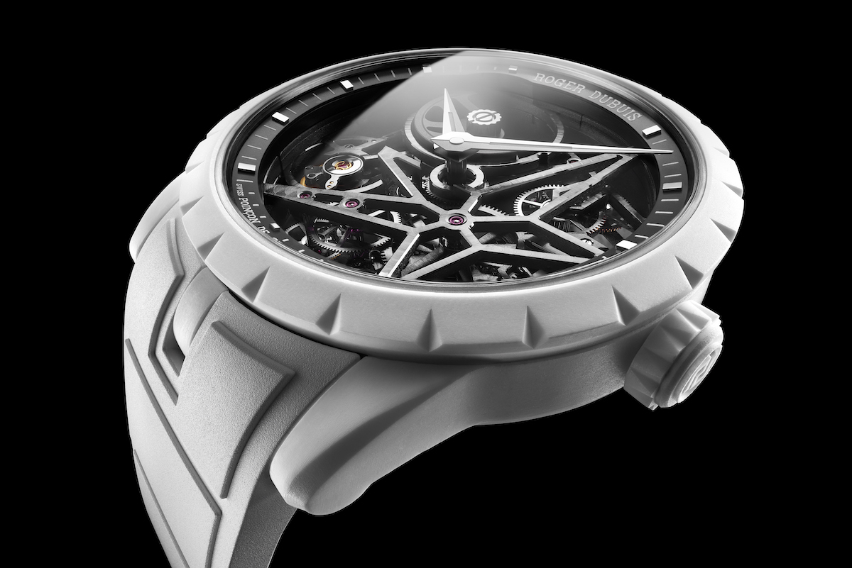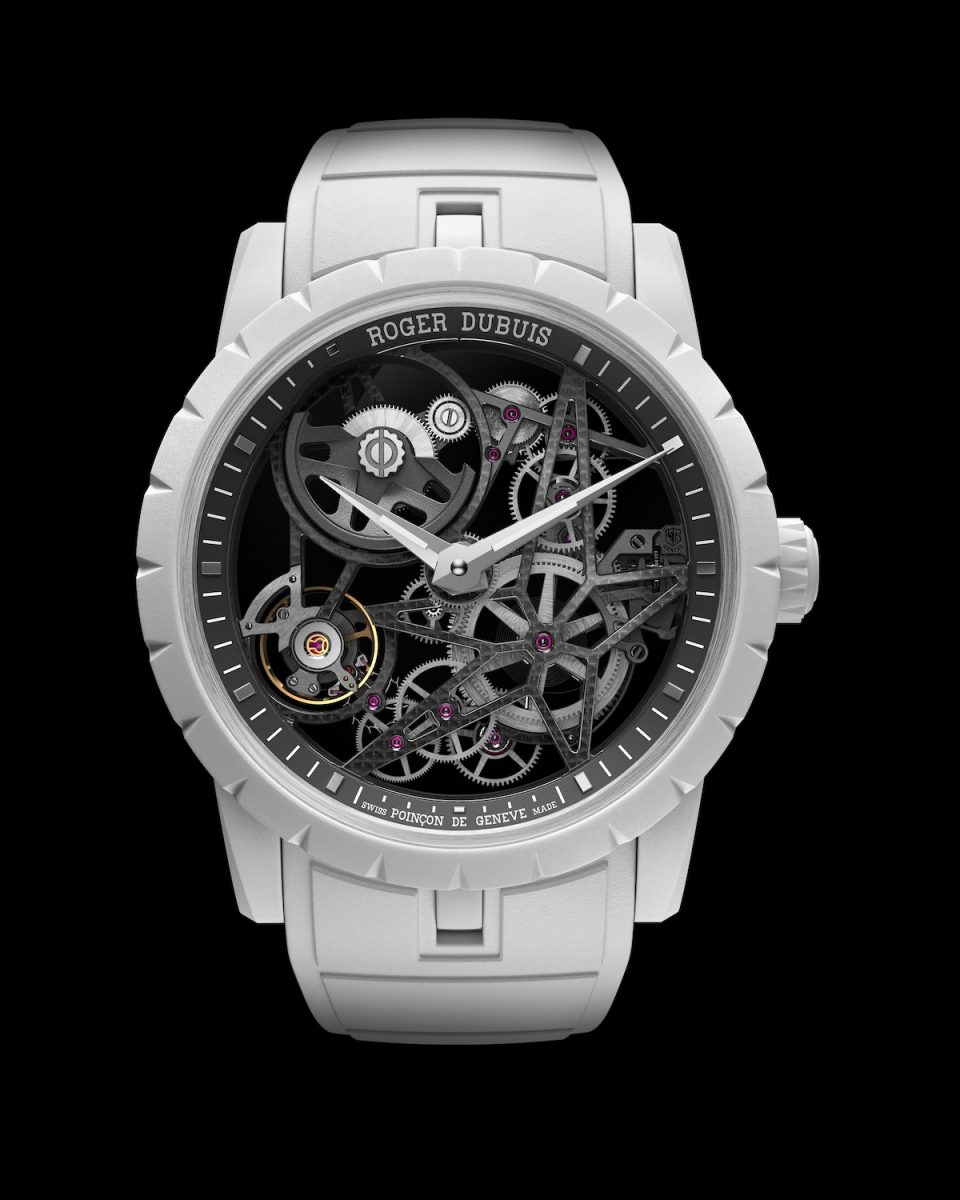 引人入勝、卓絕精湛、顛覆常規,Roger Dubuis羅杰杜彼傲然推出 Excalibur Monobalancier王者系列鏤空自動上鏈單擺輪腕錶,以礦物複合纖維 (Mineral Composite Fiber)打造格外引人注目的純淨皓白外觀,體現了品牌對顛覆成規的承諾。