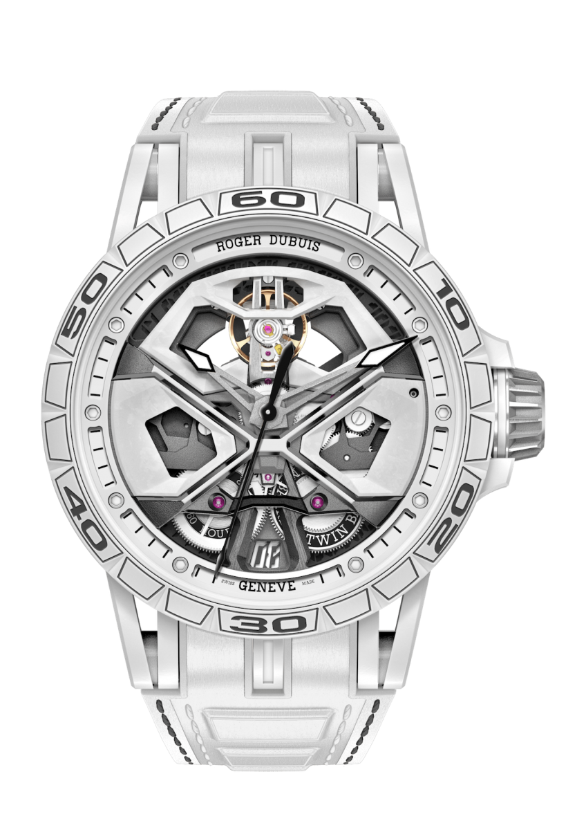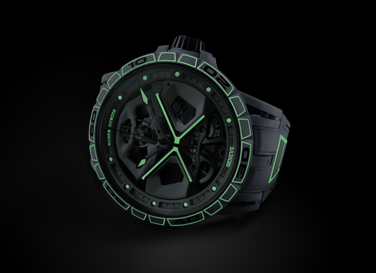 憑藉Roger Dubuis羅杰杜彼於去年推出的全球首創技藝,製錶師得以在時計的傾斜表面和「引擎室拉桿」裝飾上覆以Super-Luminova夜光塗料,成為 Roger Dubuis羅杰杜彼持續大膽創新的另一個耀眼例證,也再次展露品牌對光影藝術的熱愛與痴迷。此外,Roger Dubuis羅杰杜彼透過SuperBiwiNova硫化工序將Super-Luminova夜光塗料直接融入嵌襯白色橡膠的錶帶內部,創造出意想不到的奪目效果。