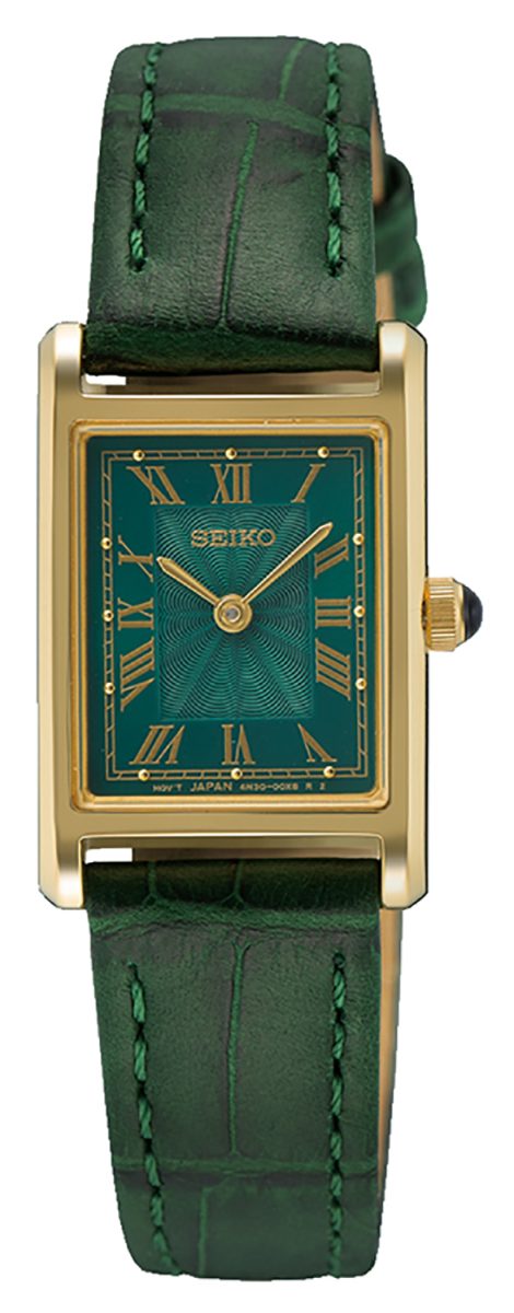 為了致敬這段「金」彩歲月,Seiko推出了三款以金色為主題的紀念腕錶,一只是復古孔雀綠面盤搭配金色長方型錶殼,加上金色經典的羅馬數字設計,帶出典雅氛圍的女士腕錶。