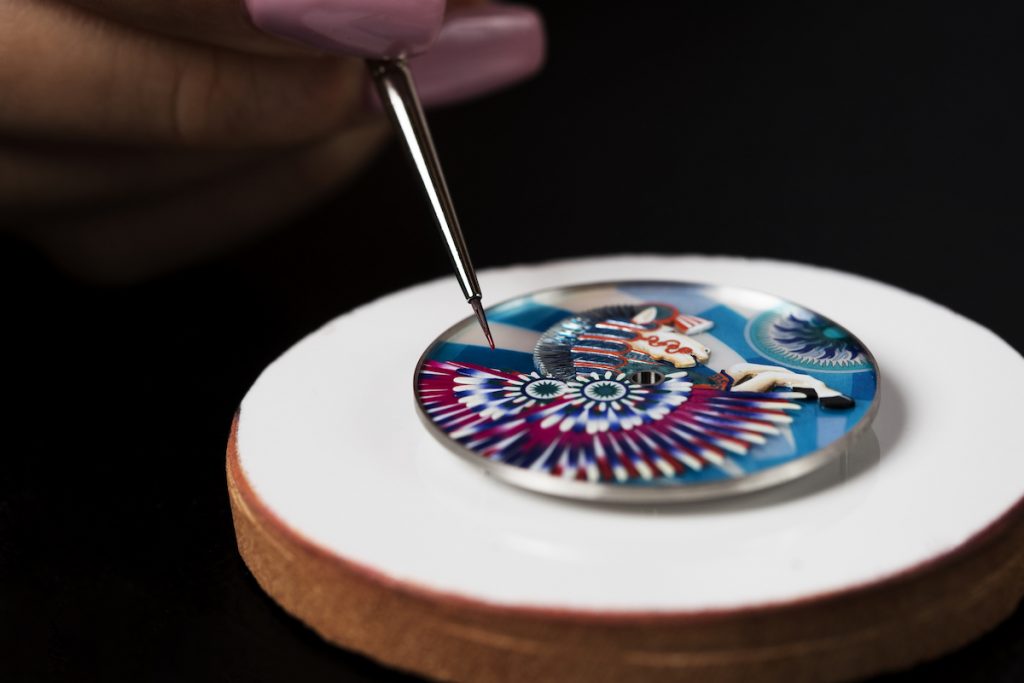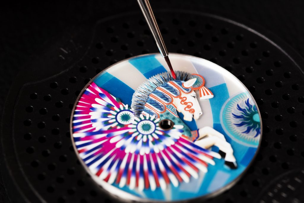 第二款同樣光芒四射的天藍色調飛馬腕錶採用鐫刻工藝完成,其以白金材質交織構成的翅膀從繽紛的珍珠母貝背景中脫穎而出。微繪藝術家用筆刷將各色顏料仔細地塗覆在珍珠母貝錶盤上,然後放入窯中乾燥。