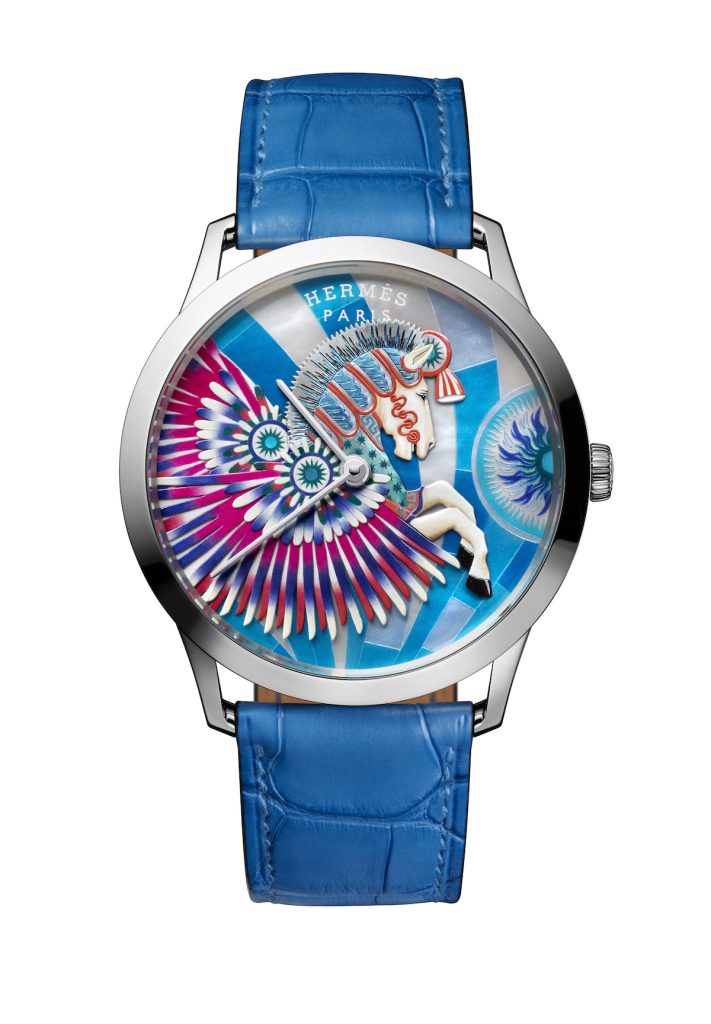 這個運用工藝技法重新詮釋的神話象徵角色,取材自法國藝術家Pierre Marie設計的La Source de Pégase絲巾。藝術家描繪了飛馬珀伽索斯在赫利孔山 (Helicon)用蹄踏擊岩石而引出希波浦泉水(Hippocrene)的神話故事。藝術家的敘事和裝飾風格創造出這匹耀眼奪目如置身奇幻愉悅宇宙的飛馬。這神話中的生物被安置在Slim d’Hermès腕錶的纖薄錶盤上,展現一種新的創意維度。