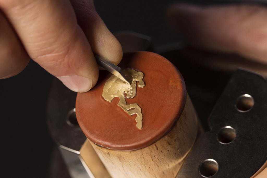 同時,鐫刻大師用雕刻刀和鑿子將白金飛馬的輪廓浮雕成形,然後再以手工上色。最後,飛馬的翅膀羽毛以珍貴的葉狀金線交織組合成數層結構,並添上明亮鮮豔的色彩。