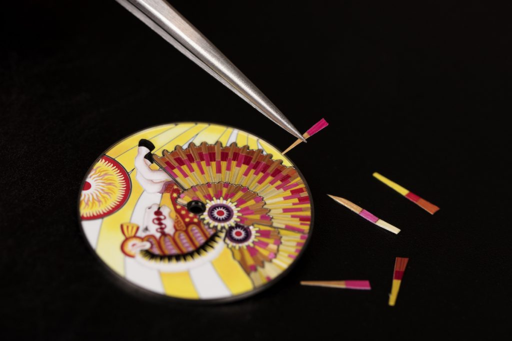 第一款以明亮黃色為主調的工藝腕錶,鑲嵌52顆長方形切割鑽石,同時結合大明火琺瑯和麥稈鑲嵌工藝。內填琺瑯背景錶盤上是縱橫交錯的空格,空格內填滿混合天然油性溶劑與彩色玻璃粉末的釉料,然後以超過 800°C的溫度去燒製來呈現色彩。