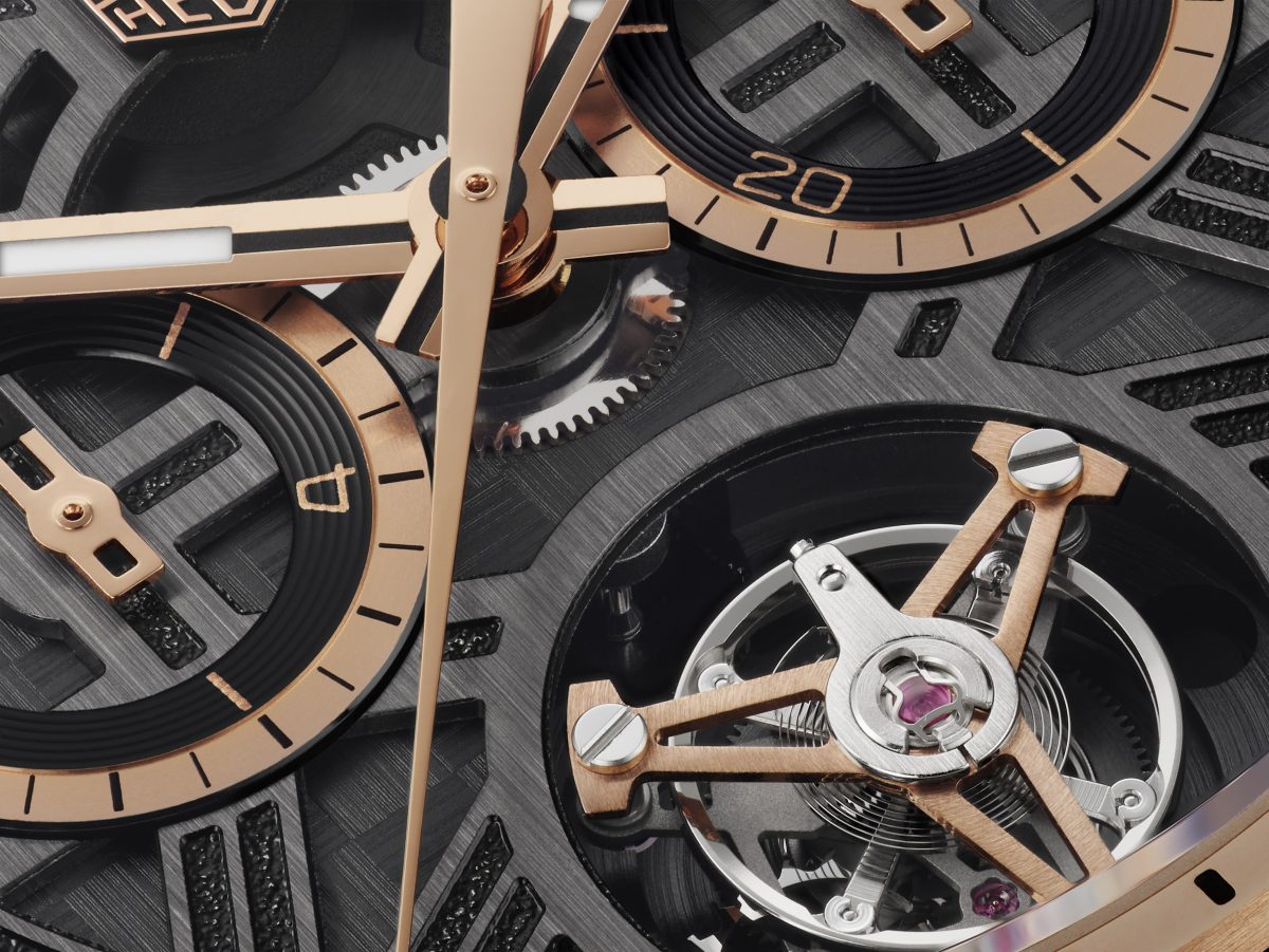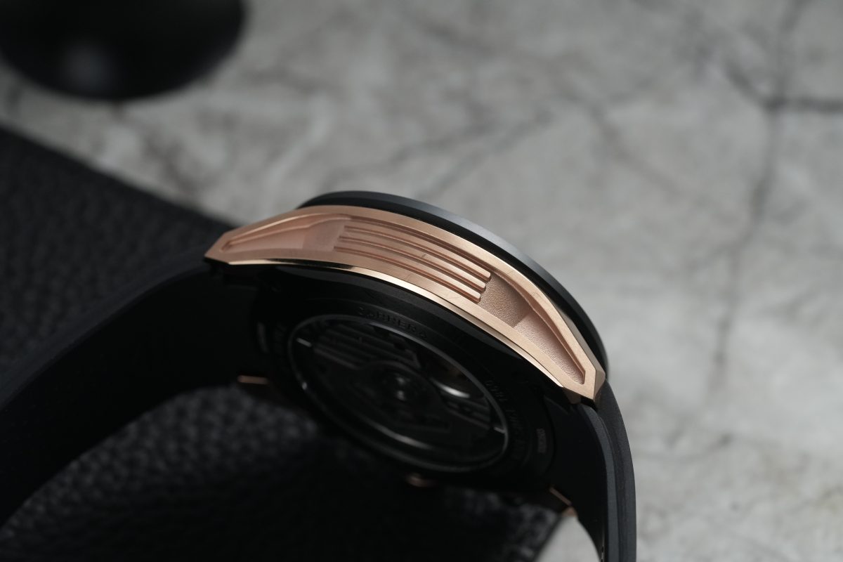 玫瑰金款則以雙材質結構展現奢華之美,錶殼為精細磨砂 18K 5N 玫瑰金打造,配以拋光錶耳支架和黑色 DLC 類鑽碳 2 級鈦金屬內殼。金質錶側採凹雕處理,並綴有粒紋飾面,引人矚目的設計更延伸 至飾以黑色標記計速刻度的 18K 5N 玫瑰金錶圈。