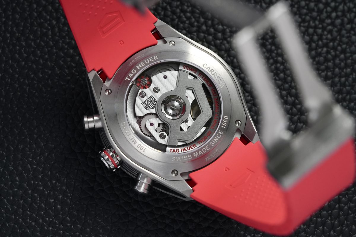 兩款腕錶均採用透明底蓋設計,可將複雜機芯結構、盾形雙向自動盤和彩色導柱輪一覽無遺。此外,鏤空錶盤下的機芯底板還飾有賽車方格旗雕紋,令腕錶更添優雅氣質及可辨性。