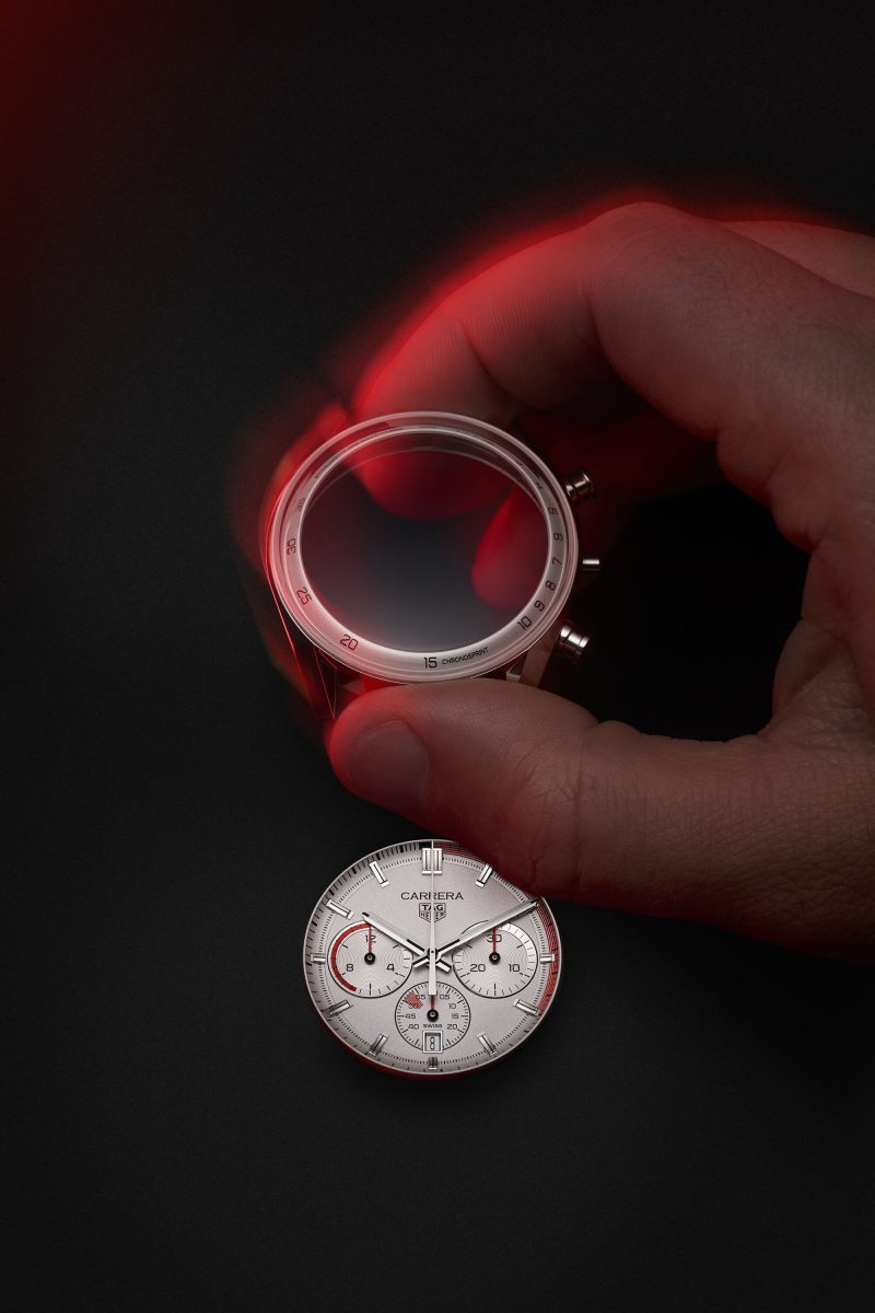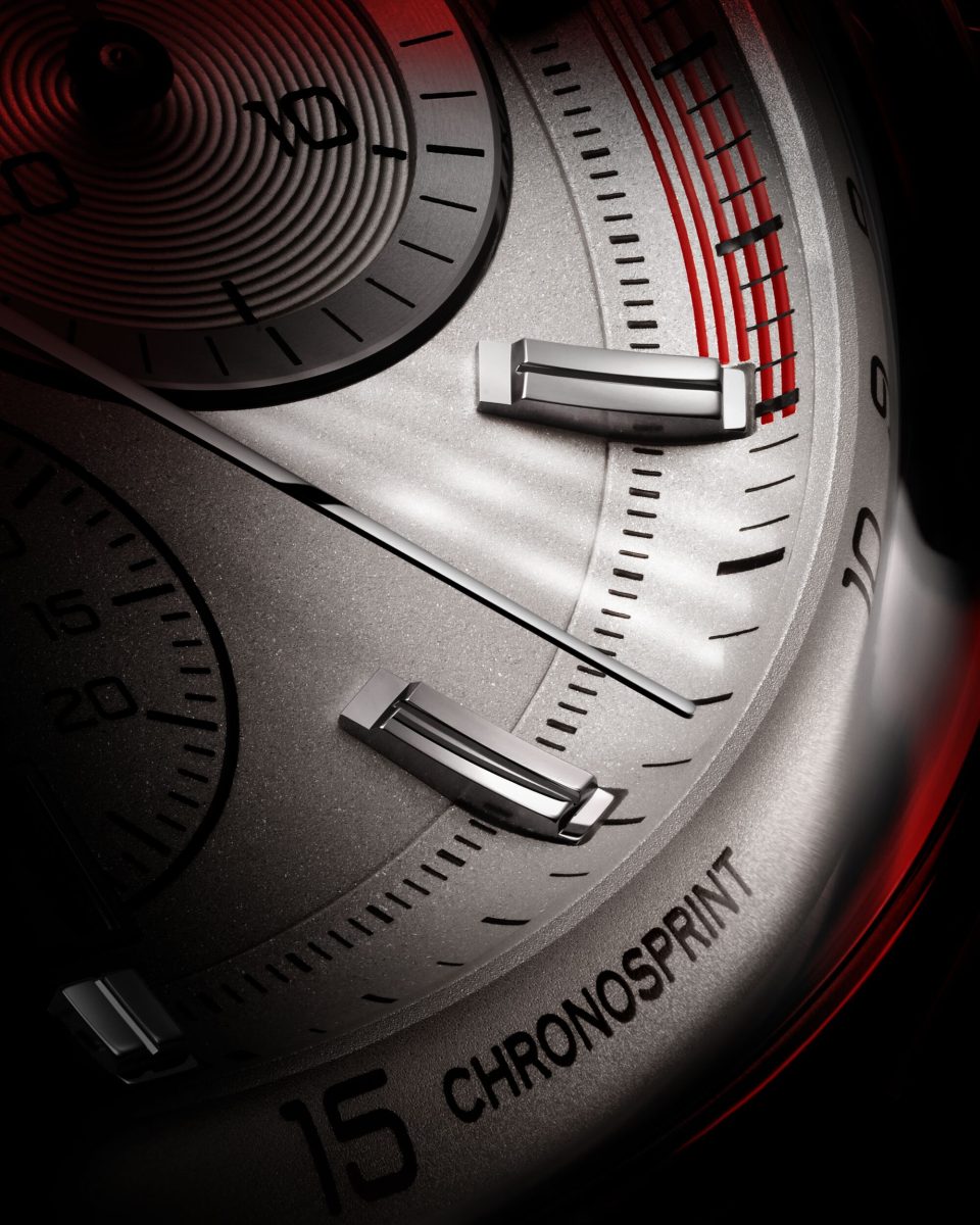腕錶各處均可見紅色細節點綴,為設計再添一抹跑車神韻。6點鐘位置的計時小錶盤上,有呼應1970年代保時捷跑車儀錶板的細節:於顯示時速50公里處的特殊標示,以突顯在市區道路的車速限制警示。致敬跑車傳統的另一細節,則可見於9點鐘位置計時小錶盤的紅色標示,象徵著跑車中央轉速錶所顯示的引擎極限提醒,避免轉速過高造成引擎損壞。TAG Heuer 選擇將紅色標示線起始於6.8小時處,並非偶然,而是呼應引擎每分鐘6800轉速的極限值。不容忽視的還有計時盤指針,造型以儀錶板指針為靈感,令此款腕錶的跑車設計美學一氣呵成。