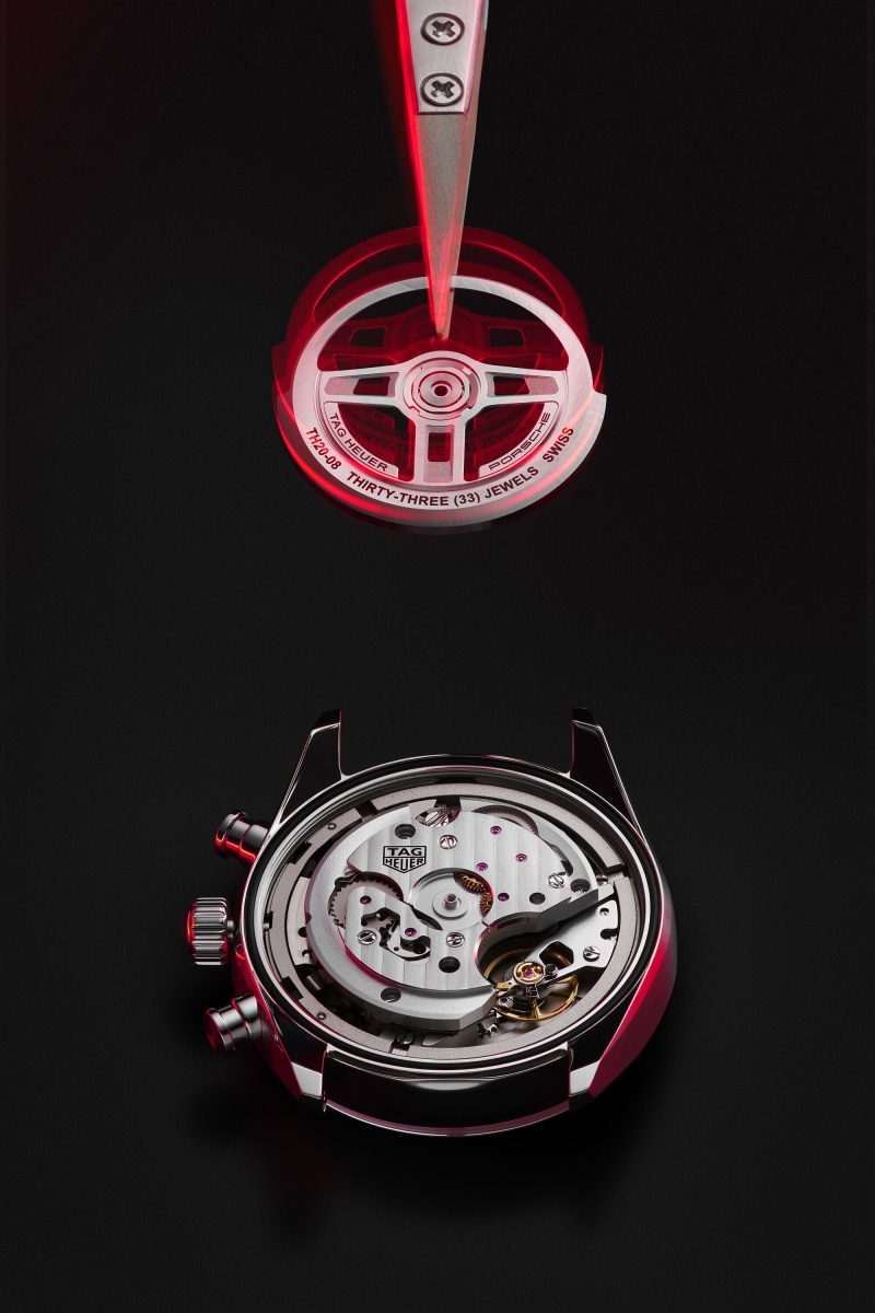 這款機芯的獨特機制為兩個蝸形齒輪,為中央指針創造出引人入勝的減速運動。此款齒輪採用廣泛應用於微機電系統(MEMS)領域的LiGA尖端製程技術製作而成。TH20-08 機芯象徵著 TAG Heuer 致力追求精準、考究工藝以及迷人設計的承諾,並樹立了製錶業的新標準。錶背並採用了復刻保時捷經典三輻式方向盤的特製專屬自動盤。