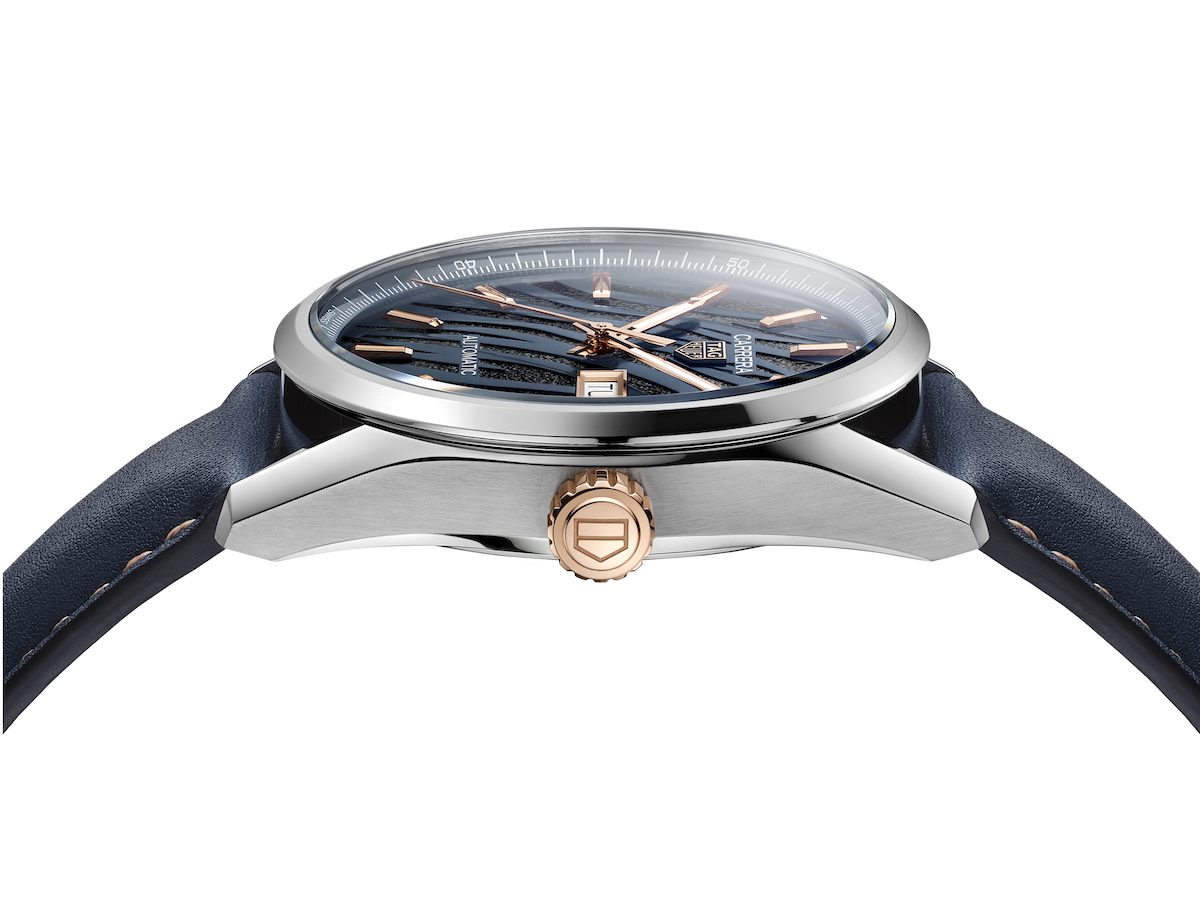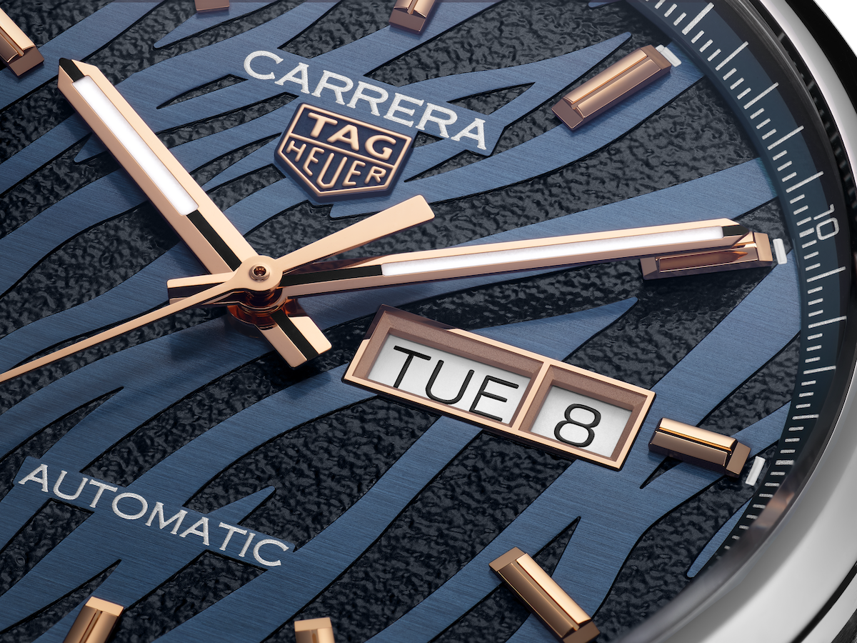 Carrera 虎年限量腕錶錶面飾以鍍 18K玫瑰金的時標、三枚指針及日期窗口,與 12點鐘位置的 TAG Heuer 泰格豪雅盾型標誌相互結合,色澤內斂的藍色虎皮條紋與耀眼的玫瑰金色在腕錶上交相輝映,展現出 TAG Heuer 泰格豪雅細膩的製錶工藝。