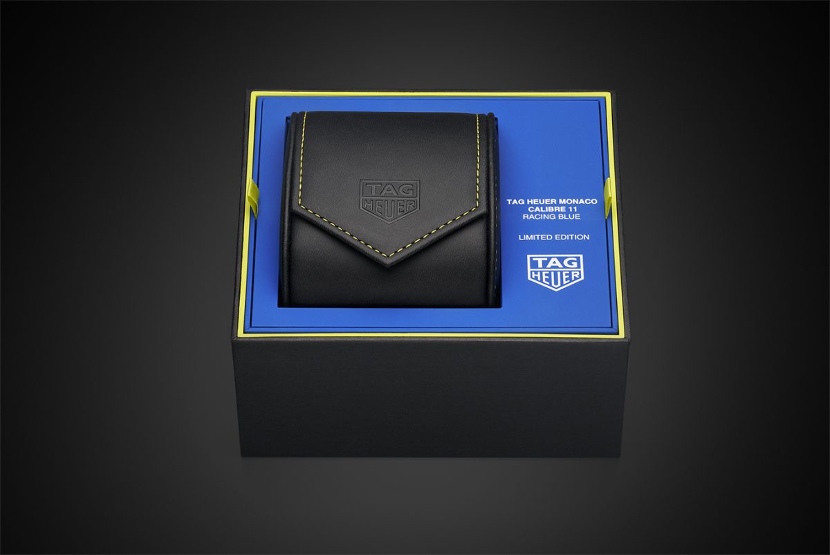 腕錶搭配亮藍色小牛皮錶帶,並採賽車款招牌穿孔設計。飾有鐫刻 Heuer 標誌的鈦金屬雙重摺疊扣將錶帶固定於手腕上。底蓋則鐫刻有限量版「Limited Edition」與「One of 1000」字樣,以及配備有特別設計裝飾以萊姆黃縫線細節的旅行錶盒及亮藍色包裝盒。