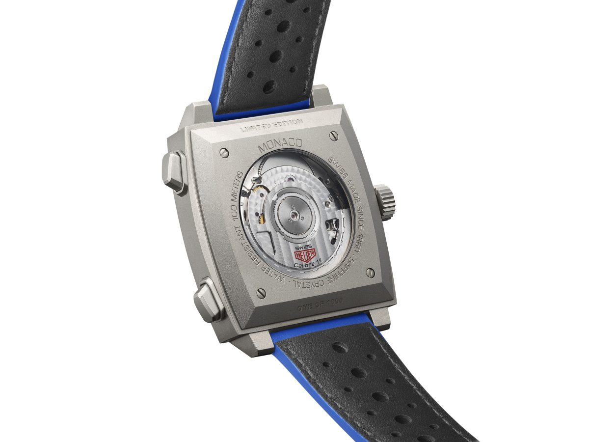 TAG Heuer Monaco 計時腕錶賽車藍限量版搭載自動計時機芯 Caliber 11,並採用兼具堅固與極輕盈特性的噴砂2級鈦金屬錶殼,內部機芯構造可透過藍寶石水晶透明底蓋一覽無遺。