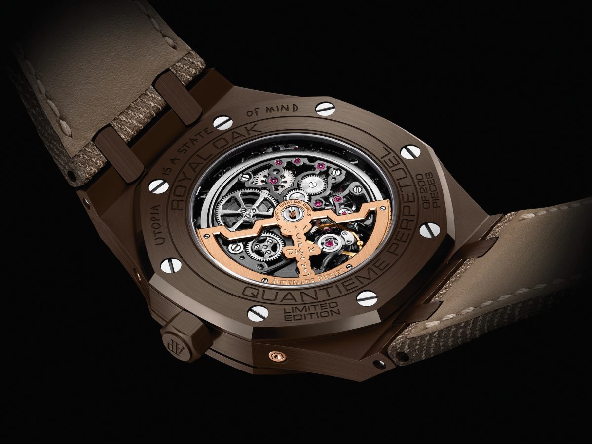 全新紋理小牛皮錶帶隨著這款腕錶首次亮相,搭配刻有愛彼標誌與Travis Scott簽名的玫瑰金折疊扣。底蓋刻有「Royal Oak Perpetual Calendar」(皇家橡樹系列萬年曆腕錶)、「Limited Edition of 200 Pieces」(限量版200只)及「Utopia is a state of mind」字樣。後者致敬Travis Scott最新專輯《烏托邦》,亦印於錶帶的一個固定環上。