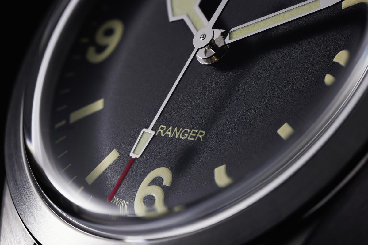 為展現功能特性,Ranger的39毫米錶殼及錶帶均經磨砂處理,以營造整體啞面效果,彰顯「功能腕錶」的純粹精神。但同時,外圈內緣等細節之處則經拋光處理,突顯出錶殼的優雅線條。錶面則以延續經典的細節處理,以夜光塗層填充鐘點標記。米色的鐘點標記與啞黑色粒紋錶面形成鮮明對比,又與帝舵表盾牌標誌及銘文的色調和諧一致。指針則採用獨特箭頭形指針,時針輪廓圓潤,秒針棱角分明,淋漓展現Ranger美學風格。秒針尖端的酒紅色尤具新意。