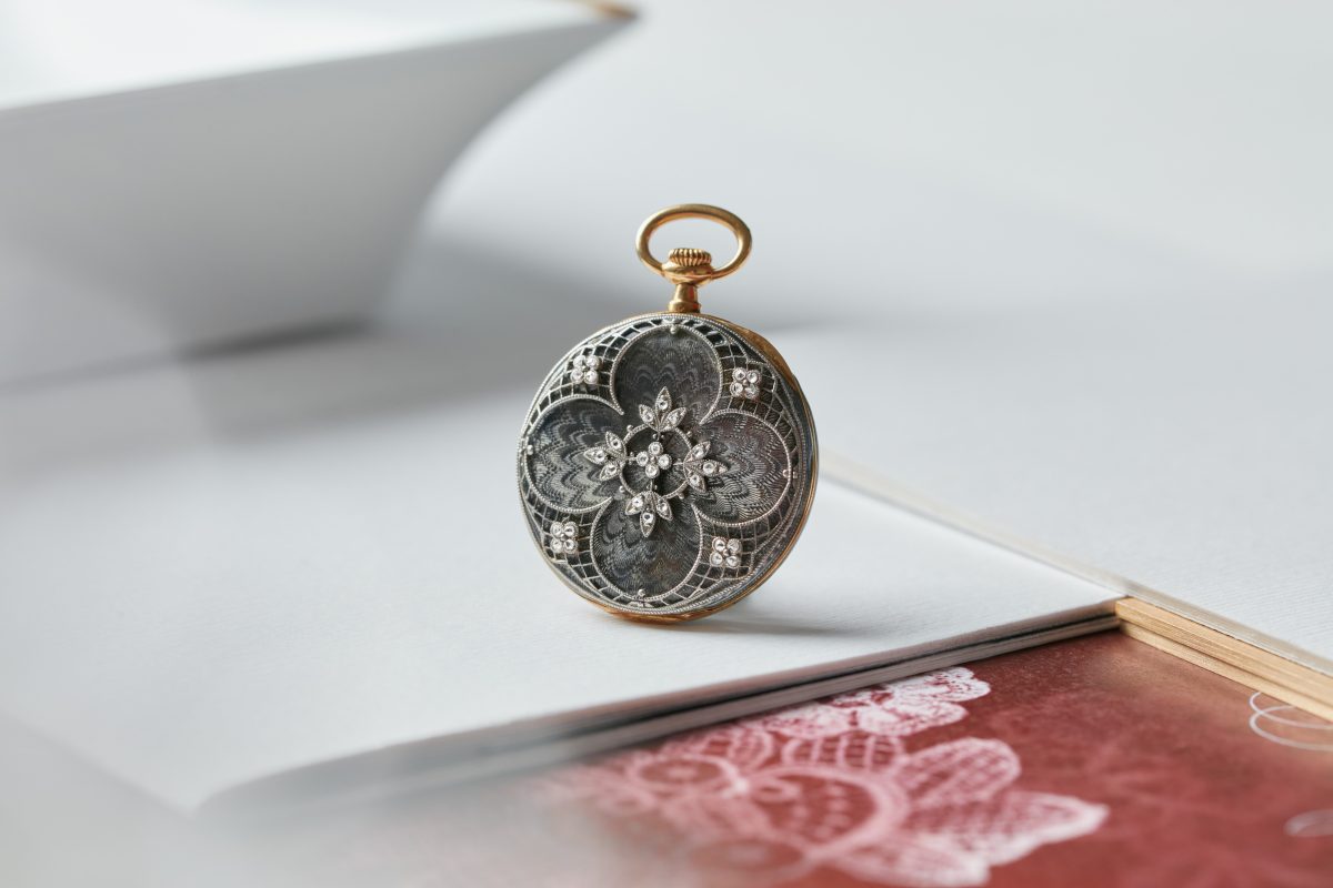 20 世紀的頭幾十年充滿了創作動能,凡此自然也對製錶業造成了影響。當時江詩丹頓正在生產源自先進美學研究與象徵了精緻工藝的藝術款式。這只垂式錶款直徑28mm ,搭載手上鍊機芯,精密機刻的鉑金底座上裝飾有透明琺瑯花朵。這裡的幾何造型呼應到鑲鑽底蓋上的四葉幸運草。精雕的邊框裝飾有寶石,與頂部黃金的錶冠頸部和吊環形成鮮明的色彩對比。