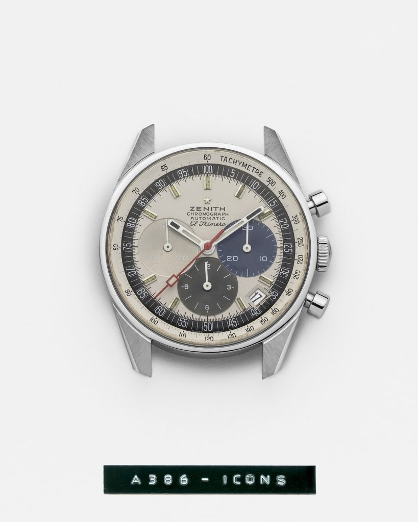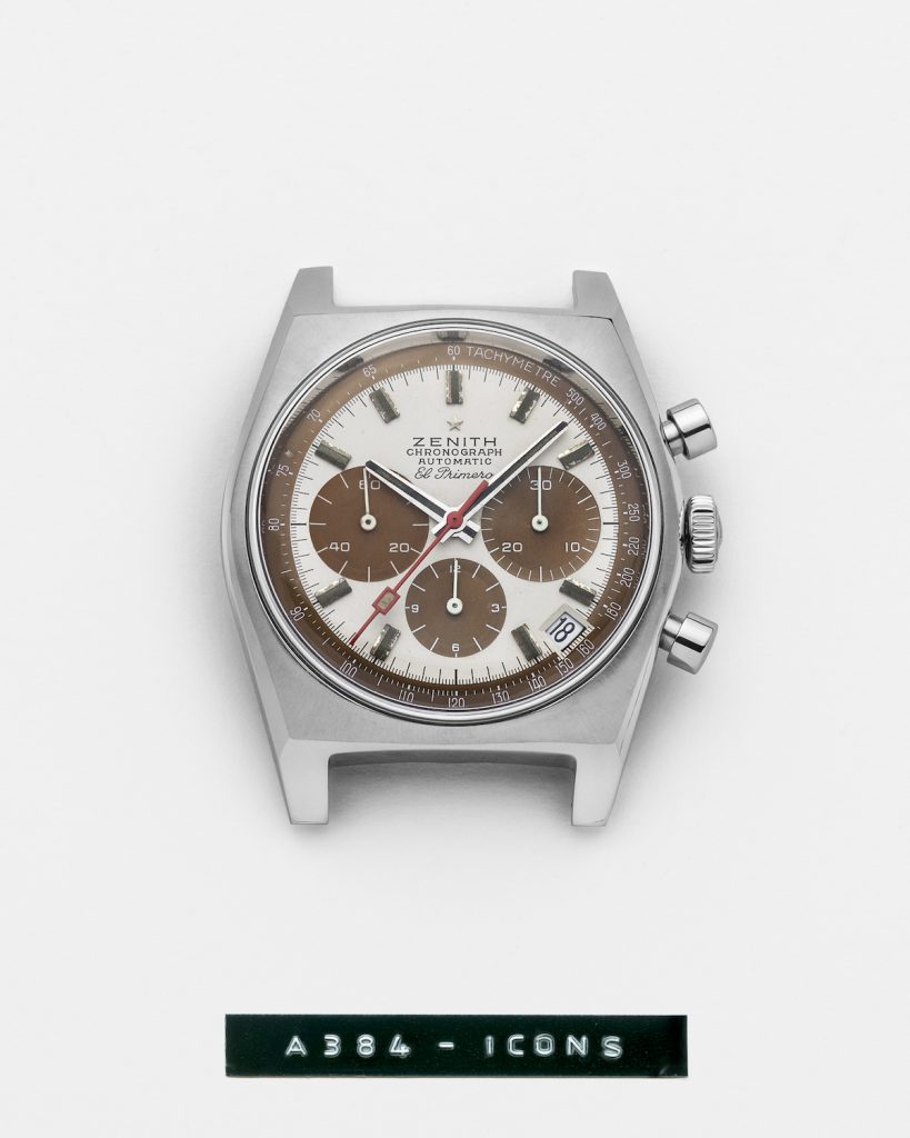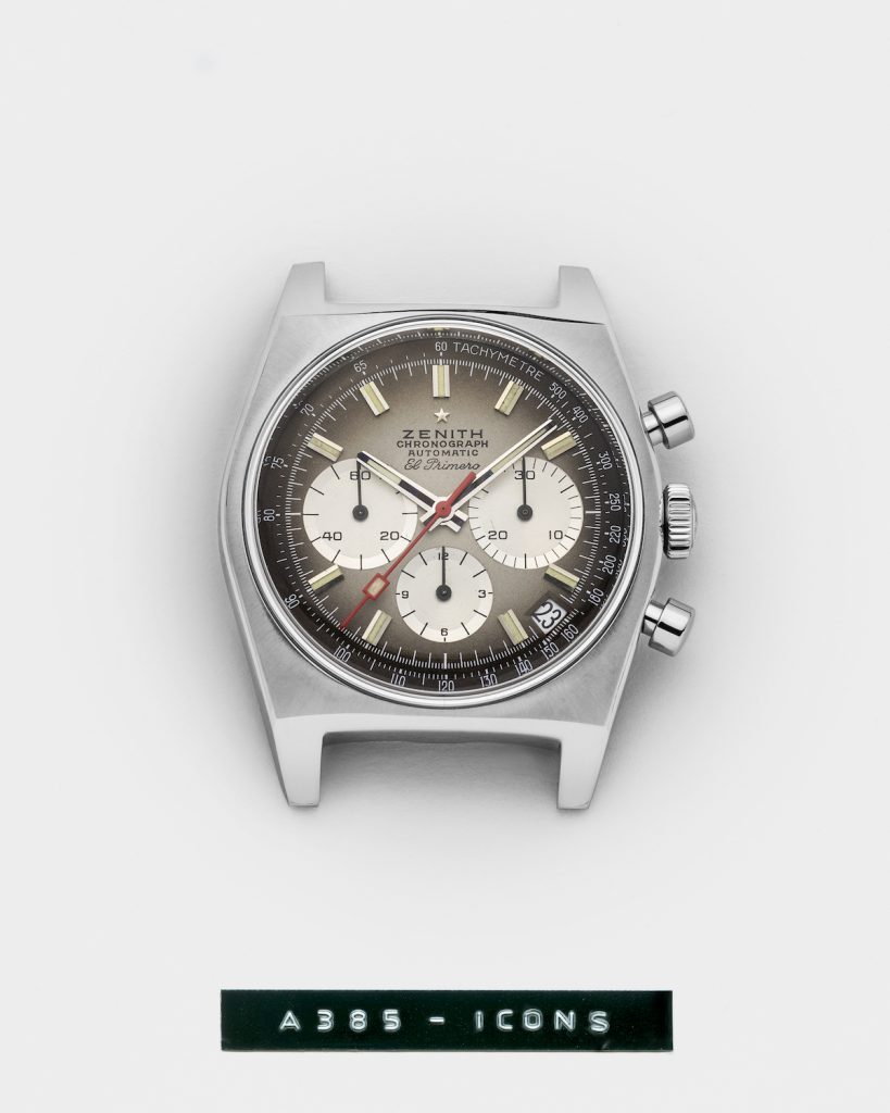 Zenith歷史上曾推出三款搭載El Primero機芯的精鋼錶款,A385腕錶即是其中一款,並於1969年被選用於廣告與拍照宣傳。這款腕錶配備當時前所未見的漸層「煙燻棕色」錶盤,搭配綴以真力時四角星標誌的「正方酒桶形」錶殼,在時代留下印記。