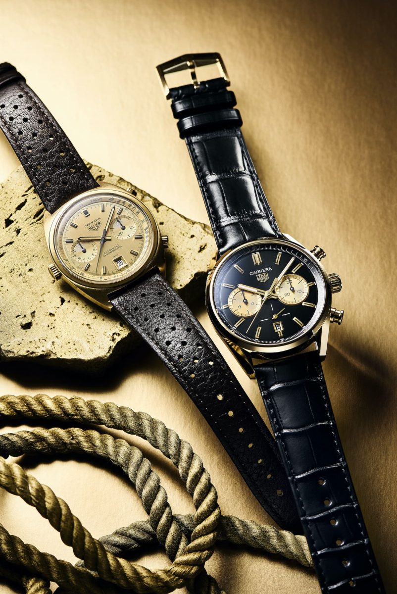 圖左,Heuer Carrera黃金自動計時腕錶,1158CH,1969年
