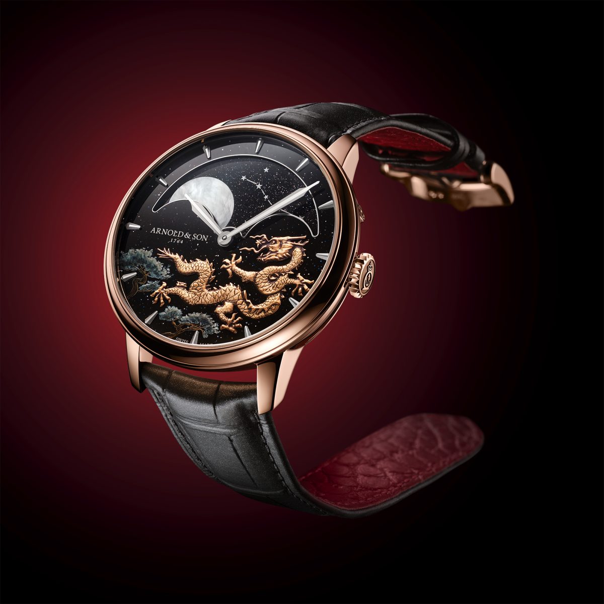 搭載由Arnold & Son錶廠完全自主開發、加工、組裝和調校的A&S 1021手上鍊機芯,除了超精準月相外,還配備錶背的月齡輔助顯示,並可透過錶冠直接調校月相功能,加上90小時動力儲存,Luna Magna皓月紅金「龍年」腕錶堪稱實用與美感兼具,將品牌精湛嫺熟的製錶技術發揮得淋漓盡致。