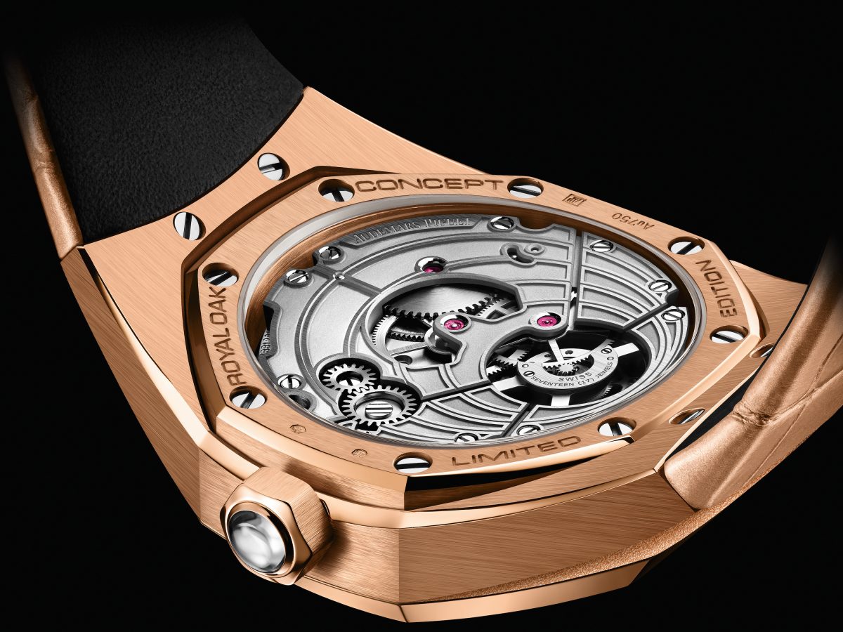 經防炫光處理藍寶石水晶玻璃底蓋鑲嵌於18K玫瑰金八角外框中。外框經霧面打磨與拋光倒角交錯處理,並刻有「Royal Oak Concept Limited Edition」(皇家橡樹概念系列限量版)字樣。六角錶冠呼應著錶圈上的六角精鋼螺絲,並經霧面打磨與亮面拋光交錯處理,熠熠生輝。不僅如此,錶冠還鑲飾半透明凸圓形藍寶石,為錶殼的整體設計增添一抹迷人的女性氣質。