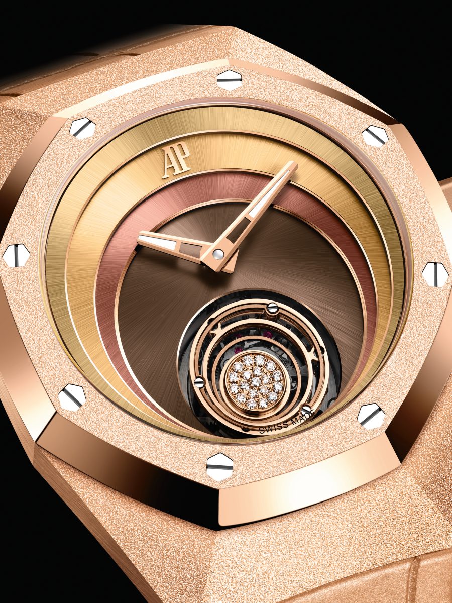 在6點鐘位置不停旋轉的飛行陀飛輪結合精湛工藝與多層次絢麗外觀,與多層次環形錶面相呼應。陀飛輪上層框架採用三環結構,環繞著鑲飾19顆明亮式切割美鑽(總重約0.04克拉)的偏心式圓盤。其玫瑰金色調與18K玫瑰金時分針和諧一致,時分針內填螢光塗層,在黑暗中依然醒目易讀。立體玫瑰金「AP」標誌設於12點鐘位置,為錶面設計畫下點睛之筆。為了彰顯簡潔和諧之美,錶面無設置時標。