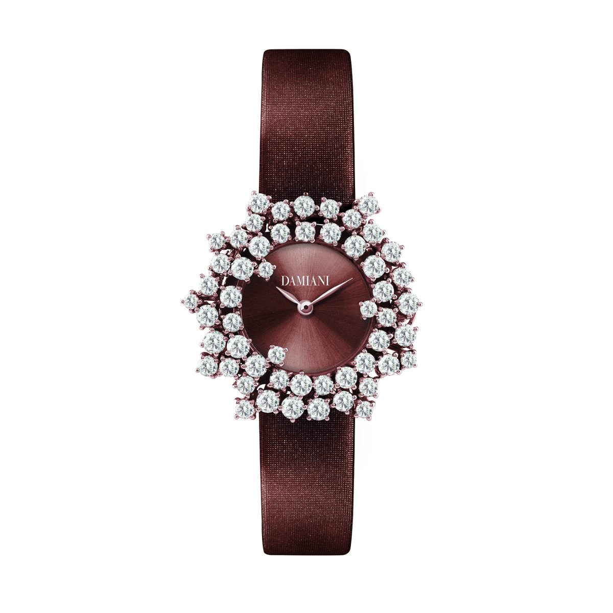 DAMIANI Mimosa含羞草系列18K玫瑰金鑽錶/巧克力色太陽紋錶盤/巧克力色緞面錶帶/錶徑:32mm/建議售價:NTD 830,000