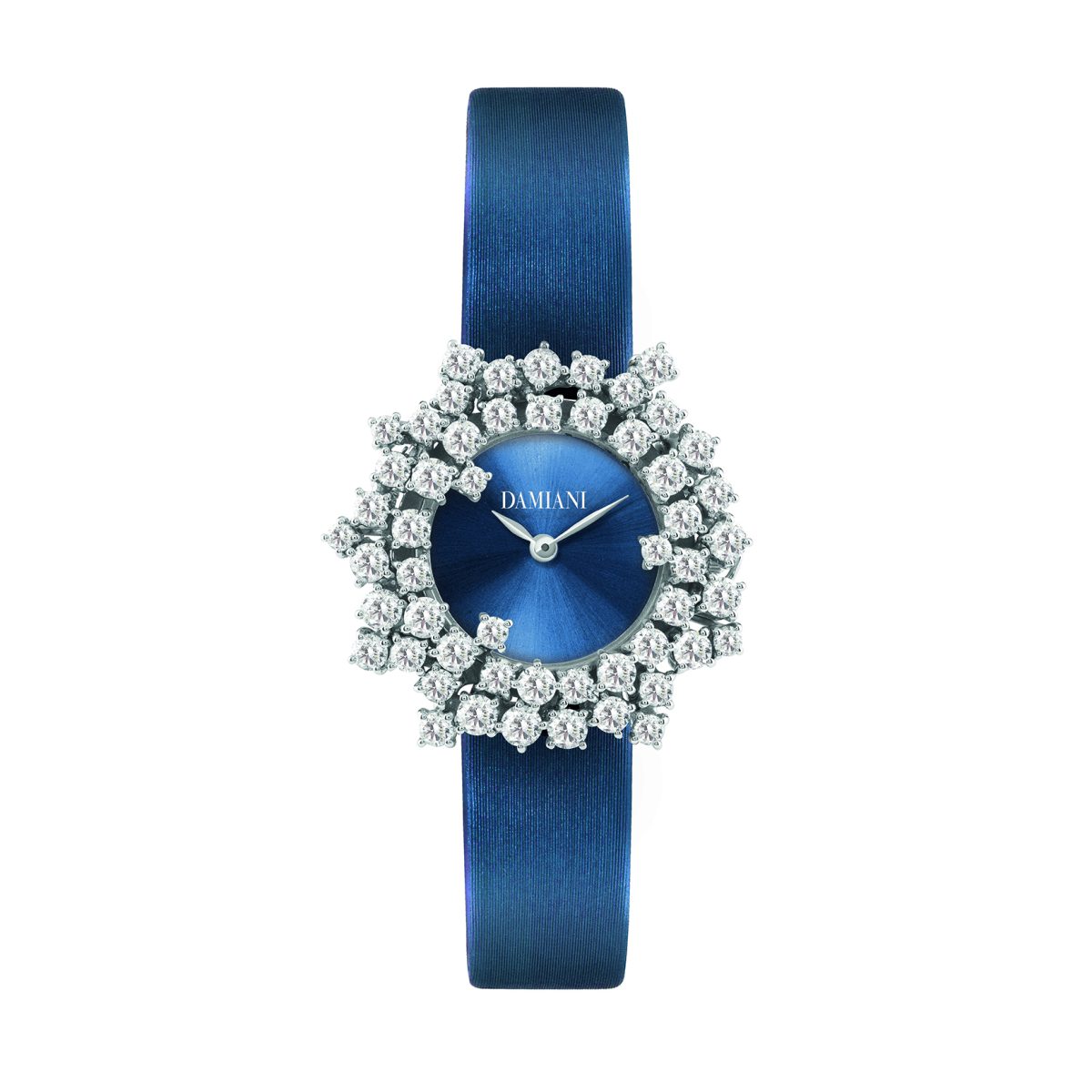DAMIANI Mimosa含羞草系列18K白金鑽錶/藍色太陽紋錶盤/藍色緞面錶帶/錶徑:32mm/建議售價:NTD 830,000