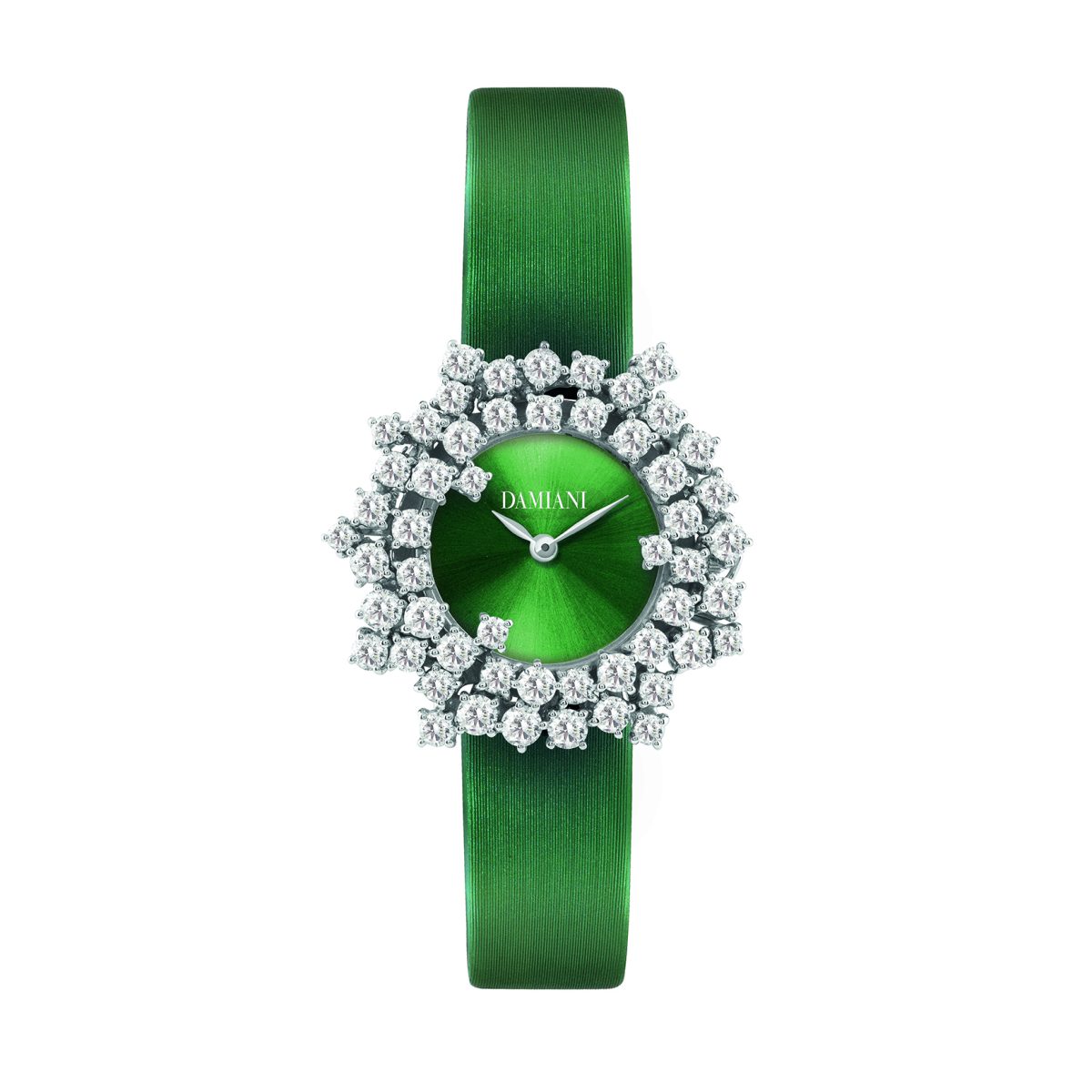 DAMIANI Mimosa含羞草系列18K白金鑽錶/深綠色太陽紋錶盤/深綠色緞面錶帶/錶徑:32mm/建議售價:NTD 830,000