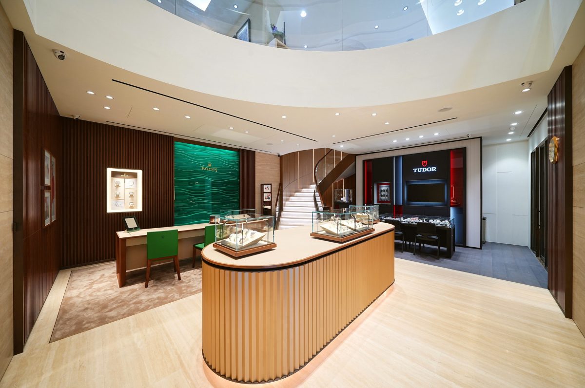 走進店內立刻映入眼簾的是業界少見從一樓挑空至三樓的奢華氣勢,整體空間皆以極耗時耗工的天然大理石材為主輔以沉穩實木材質,展現明亮而溫暖的氛圍。一樓空間完整呈現了 ROLEX 勞力士及 TUDOR 帝舵表的最新形象專櫃區。