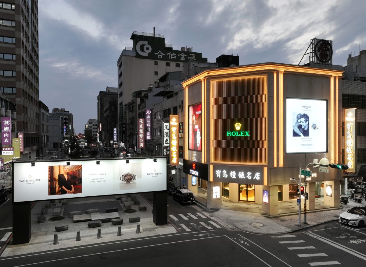 全新寶島鐘錶高雄名店坐落於高雄市鹽埕區大勇路 119 號,從建築物外觀、店內陳列、洽談區到對外的大櫥窗,都以與國際同步的最新形象和材料做裝修。特別的是,瀏覽世界各地的鐘錶名店,鮮少能夠見到這樣具有氣勢的建築外觀,長達 23 米寬、14 米高的大型三角窗,以大理石搭配巨幅高級鐘錶的品牌視覺,無論是白天或夜晚,這裡都是南台灣最搶眼的鐘錶亮點。