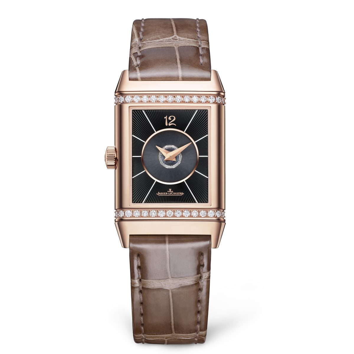 全新 Reverso Duetto Medium 翻轉系列雙面腕錶中型款精鋼版設有閃亮的藍寶石水晶背面錶盤,與 12 時位置的霧面數字時標,以及拋光精鋼的冷色調形成優雅對比,更與正面錶盤的藍色指針和亮面鱷魚皮錶帶完美呼應。玫瑰金錶款則配搭黑色亮漆背面錶盤,而柔和的白色正面錶盤與金色巴頓型指針相得益彰,配合數字時標和玫瑰金錶殼的色調。為了進一步強調色彩的和諧配搭,積家更首次為 Reverso 翻轉系列腕錶推出經典的亮面灰褐色鱷魚皮錶帶。