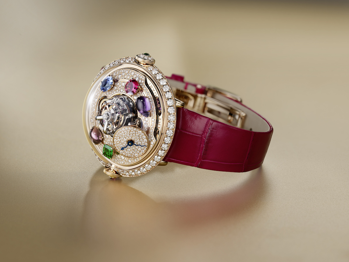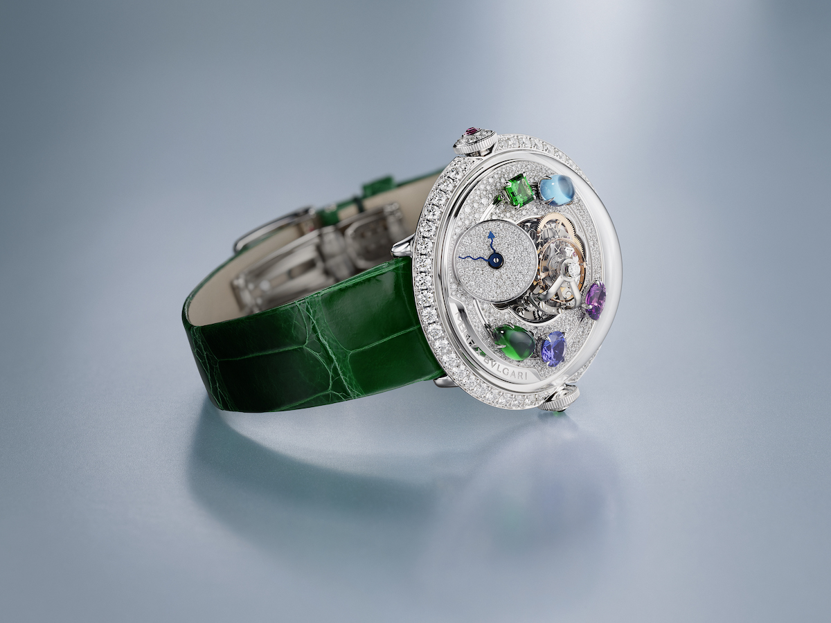 前所未見的結構,搭配以女性為本的設計,簡直是專為寶格麗而生。品牌將錶殼重新設計,更顯前衛與奢華,同時精準拿捏彩色寶石的尺寸,以搭配腕錶的份量。瑰麗絢爛的寶石洋溢寶格麗特有的熱情活力,完美平衡精微機械的一絲不苟與嚴肅本色。此次共推出白K金與玫瑰金版本,各限量生產20 只,每一只均裝飾萬中選一的碧璽、沙弗萊石、鑽石、紅碧璽、紫水晶、坦桑石與拓帕石等珍貴彩寶,以華麗至極的姿態環繞機芯。錶盤佈滿雪花密鑲鑽石,同樣令人目眩神迷。