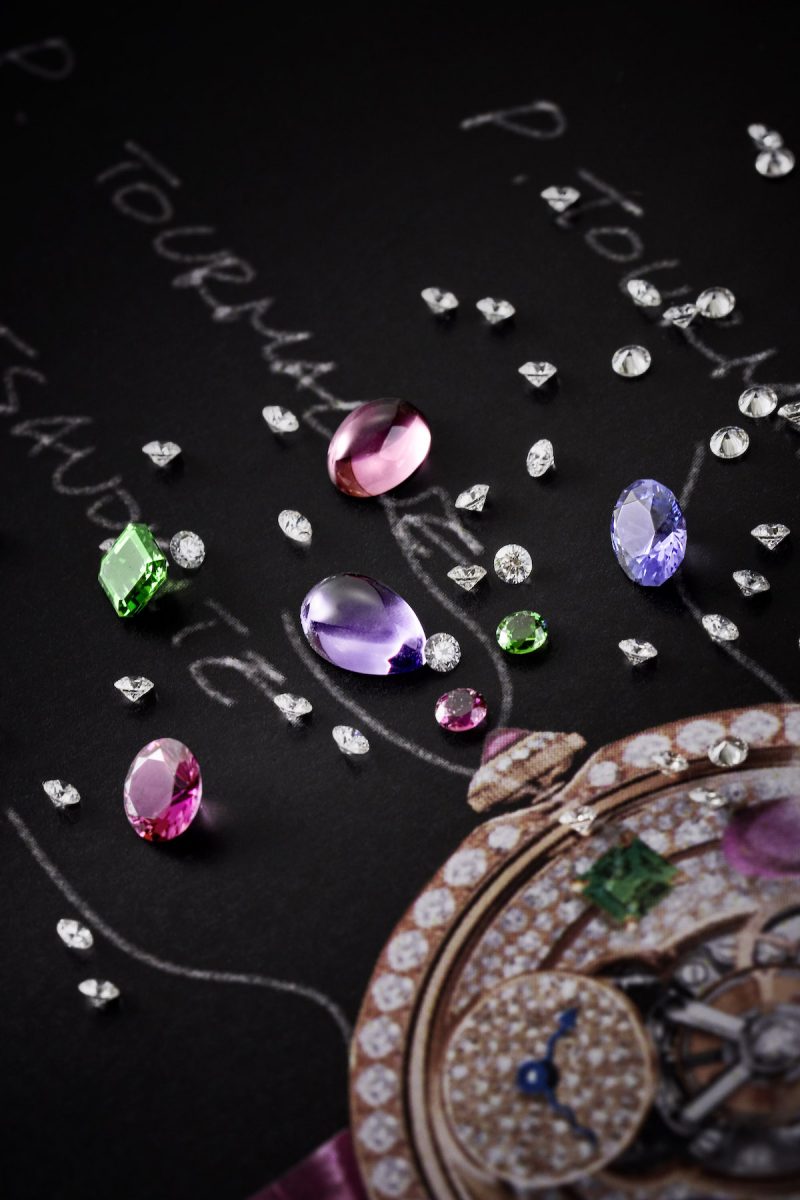 相較一般頂級珠寶設計偏好青睞鑽石,寶格麗向來鍾情於彩色寶石。依據不同錶款設計,寶格麗精心構思寶石排列組合,創造出絕無僅有的美麗漸層,既平衡和諧又能盡情釋放色彩能量。寶石的切割方式也相當關鍵,寶格麗最常使用蛋面切割,以打造最美麗澄澈的寶石,同時彰顯作品的富麗奢華。而FlyingT Allegra 豐潤圓滑的錶殼,以蛋面切割寶石來裝飾是再適合不過。