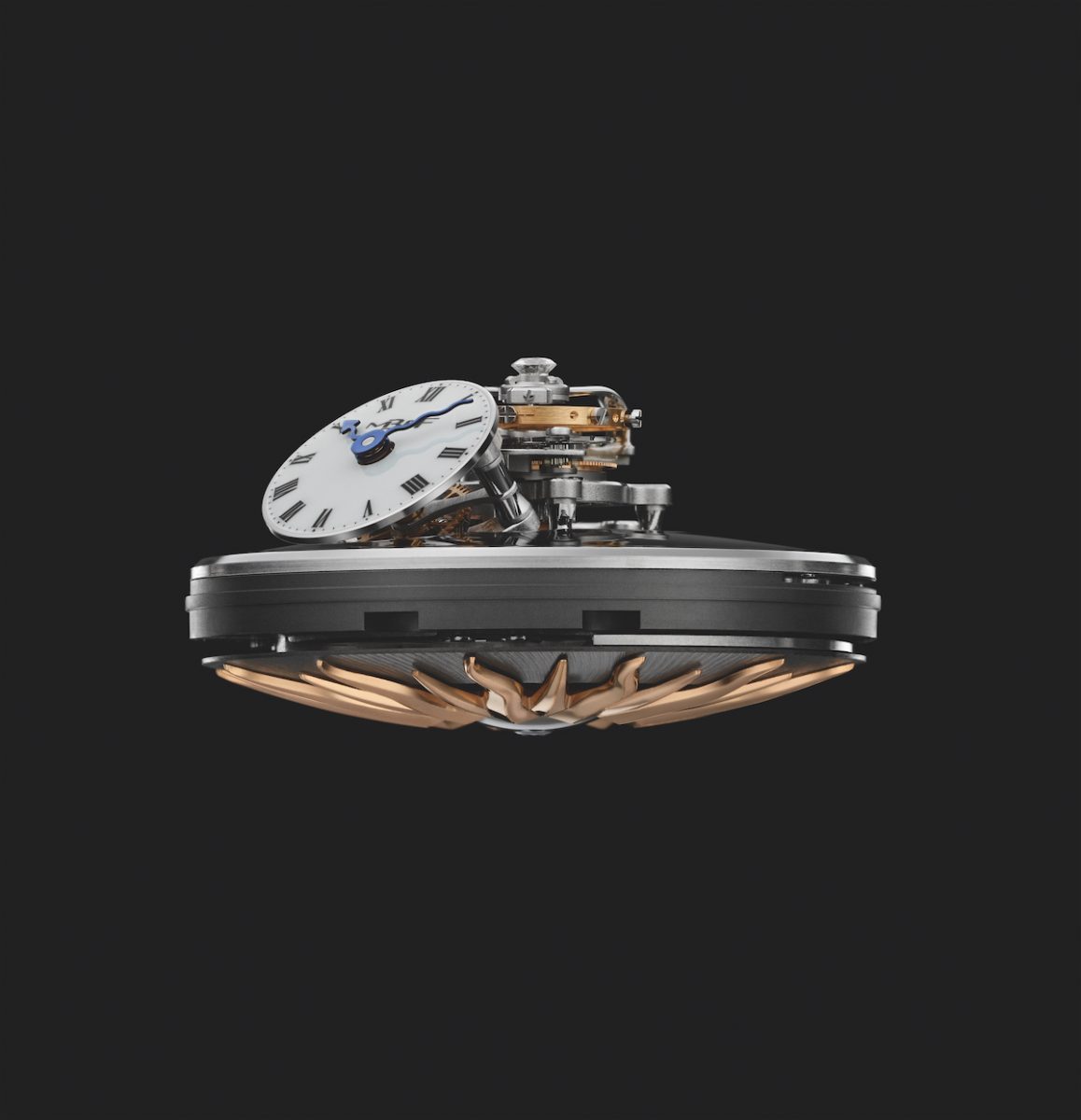 捨棄現代腕錶機芯常見的同一平面設計,LM FlyingT 機芯採用垂直同軸的方式。如電影畫面般震撼的飛行陀飛輪醒目地矗立於 LM FlyingT 的錶盤,展現擒縱機制吸睛視覺效果,更與其他飛行陀飛輪腕錶呈現強烈對比,原因正是因為一般製錶並不會採用突出周圍錶盤的設計。