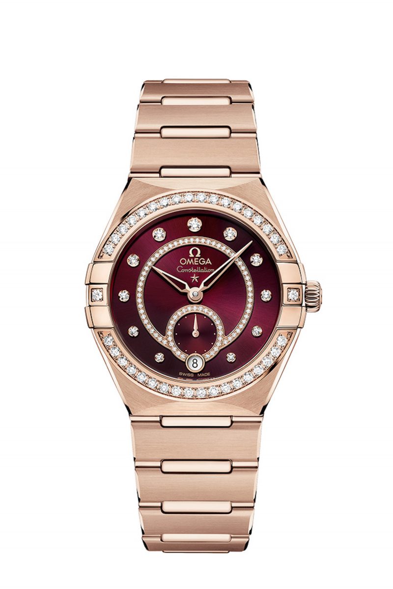 星座系列小秒針腕錶,這款精緻腕錶的酒紅色錶盤向歐米茄品牌的傳統顏色巧妙致敬。鑽石圓環,以及全 18K SendaTM金 34 毫米錶殼與錶鏈設計進一步襯托這種顏色。經典星座系列特色包括扣爪與半月形刻面。建議售價$1,166,000
