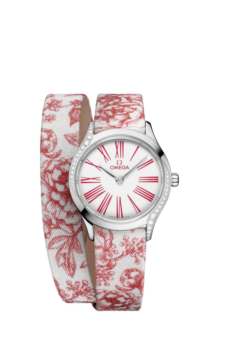 Mini Trésor 腕錶,這款 26 毫米小巧腕錶特色是沿著不鏽鋼錶殼的曲線鑲嵌著璀璨鑽石,以及米白色「大明火」琺瑯弧形錶盤。玫瑰色羅馬數字完美搭配纏繞手腕兩圈的紅色花卉朱伊紋布料 「雙圈」錶帶。建議售價$138,000