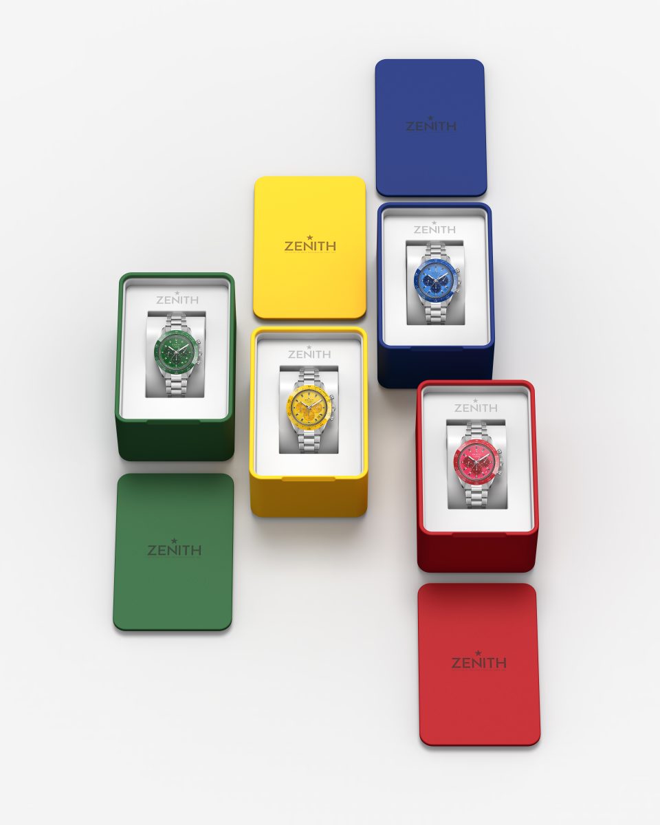 Chronomaster Sport運動計時腕錶承襲Zenith真力時非凡自動計時腕錶的傳統,突破了高振頻精準計時的界限。腕錶具有1/10秒計時功能,錶圈上鐫刻10秒刻度。外型線條流暢、41毫米的精鋼錶殼堅固耐用,搭配泵式按鈕;四款Only Watch 2023獨一錶款具有色彩鮮艷的陶瓷錶圈,配備同色系的藍色、紅色、綠色、黃色漆面錶盤。這些陶瓷顏色是Zenith真力時從未使用的顏色,令腕錶套裝更顯非凡。錶盤不再採用典型的El Primero三色設計,而是呈現與陶瓷錶圈一致的色調。