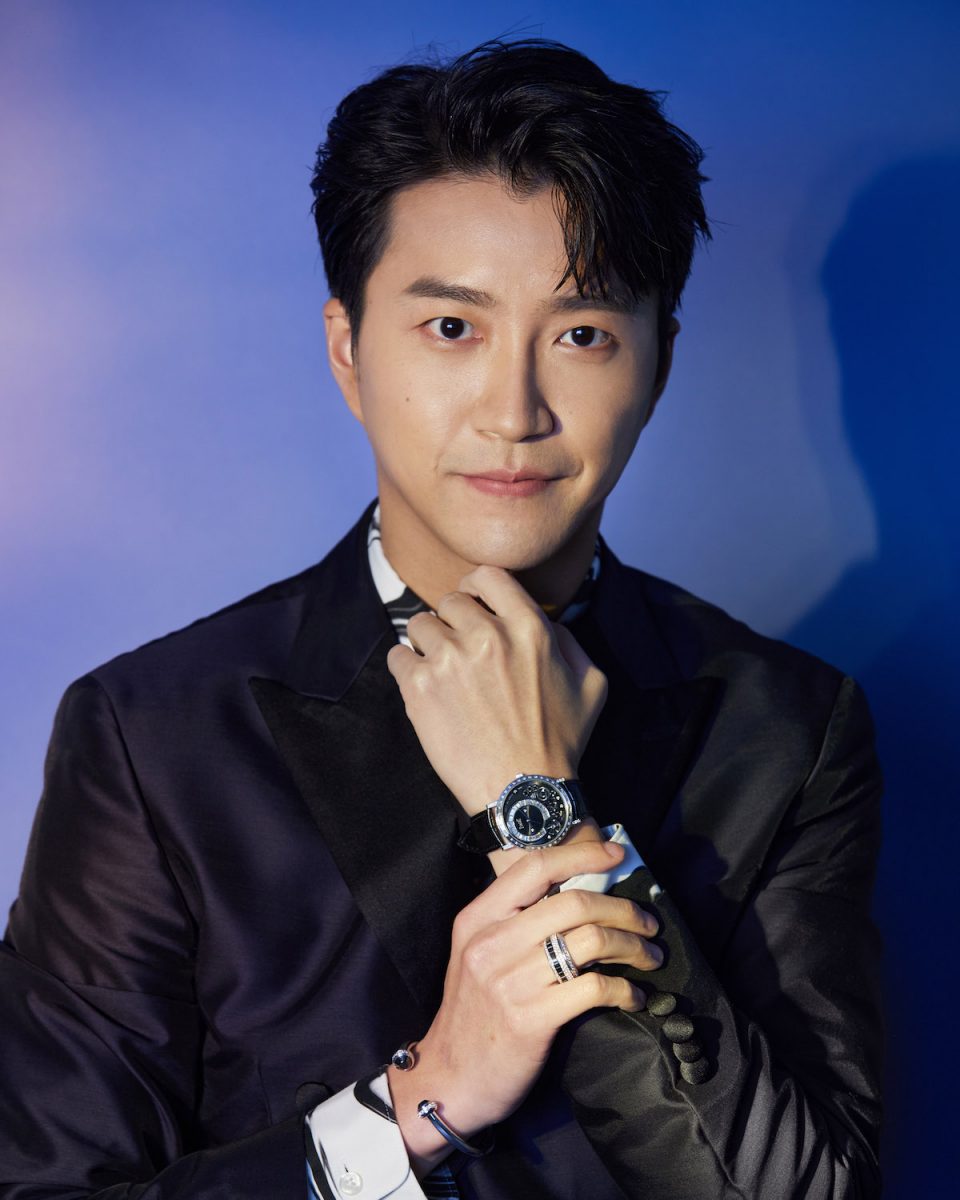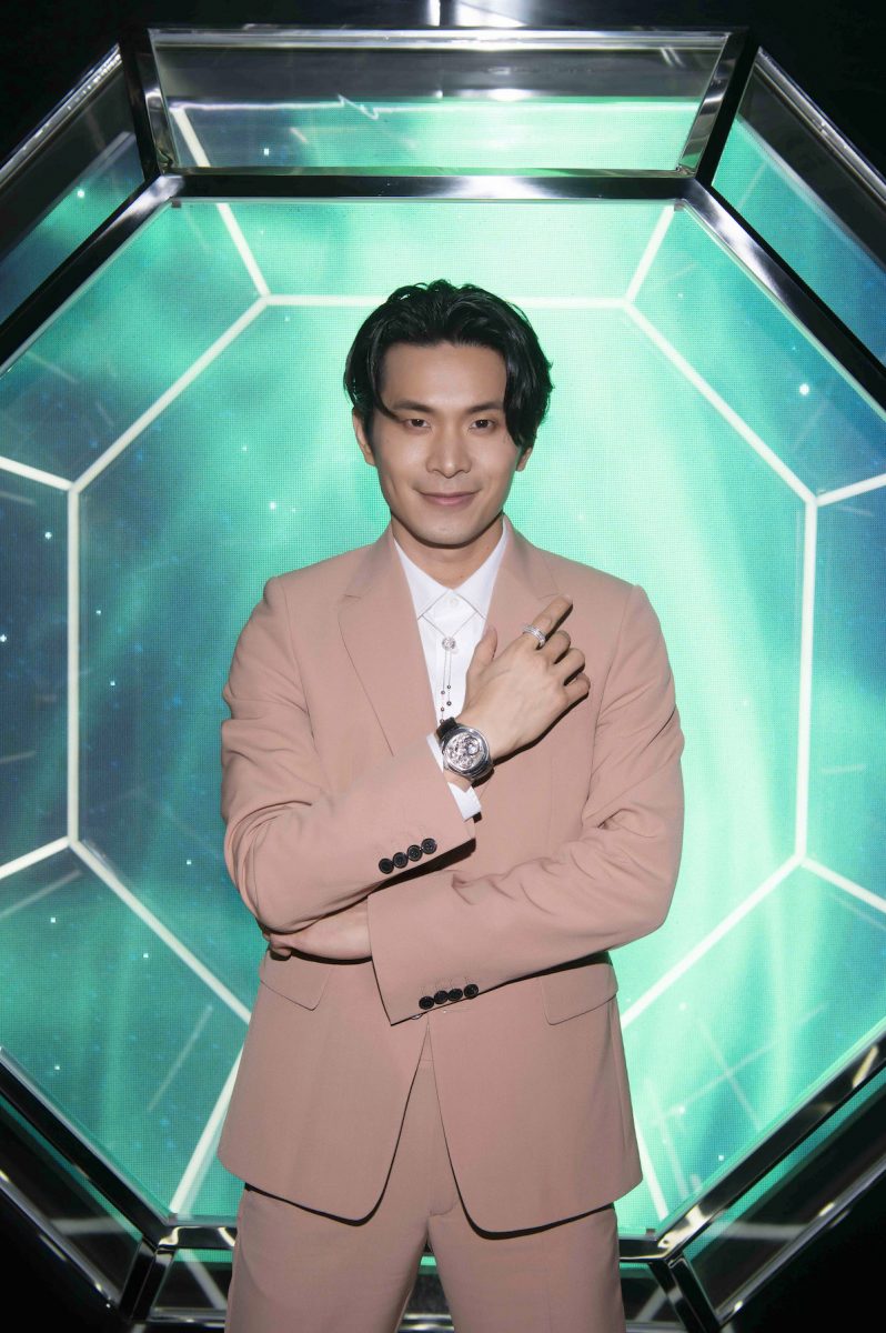 型男隊長江宏傑以一身深灰色雙排扣西裝與印花襯衫,搭配PIAGET Altiplano 系列18K白金頂級珠寶鑽石腕錶