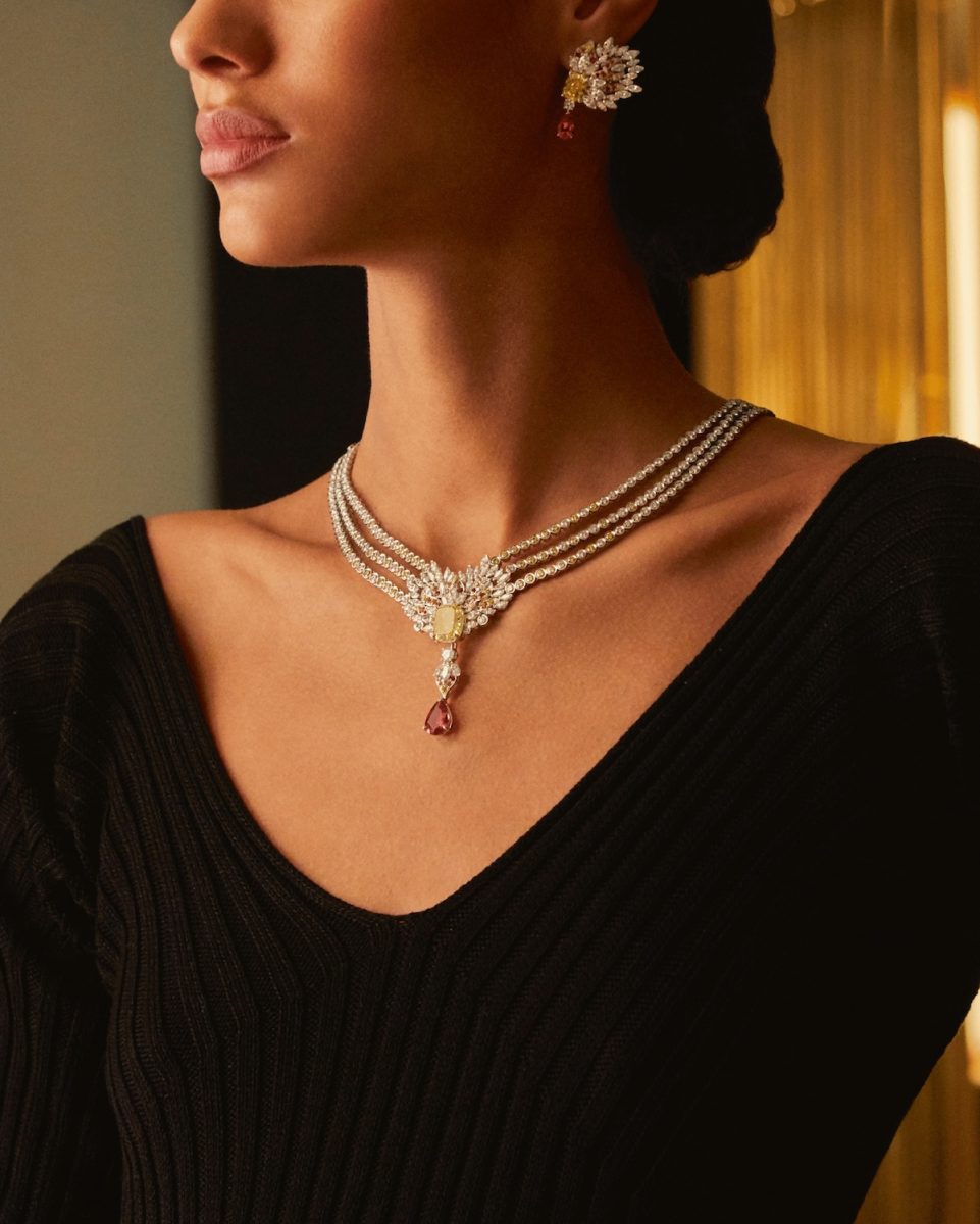在世家的奇思妙想下,沉靜的夜晚也得以展現瑰麗夢幻的面貌。結合多色寶石的艷彩黃鑽頂級珠寶項鍊即是在一件作品中描繪從白晝到黑夜變幻間的多重景致。項鍊正面主石為一枚IF等級、重達8.88克拉的枕形切割豔彩黃鑽,搭配3.61克拉梨形切割紅色尖晶石,並與錳鋁榴石及美鑽相伴,營造出日光下歡愉繁盛的迷人氛圍。順著圓形明亮式切割的黃鑽、白鑽與藍寶石連成一線,氣氛逐漸和緩,5.34克拉梨形切割斯里蘭卡藍寶石坐鎮項鍊背面的主石,宛如夜后雍容華貴。這件作品無論從何面欣賞,在在展現令人窒息的絕美。此外,該作品更可轉換多種配搭方式,包含5種項鍊配戴法及1條可銜接於兩主題鍊身的鑽石手鍊,共呈現6種配戴可能,信手拈來都是絕代風華。