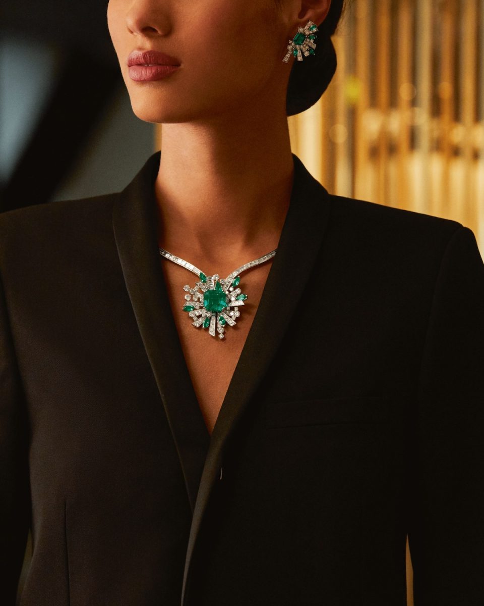 入夜後的天空成為絢麗的色彩劇場,「Magical Lights 奇幻光影」系列作品透過華麗寶石詮釋北極光令人目眩神迷的恢弘星空奇觀。本次展覽中最引人注目的,即是一套以哥倫比亞祖母綠為主石所設計的頂級珠寶系列作品,整套作品中的祖母綠耗時超過2年蒐羅而來。其中的項鍊作品以碩大且珍稀的16.84克拉哥倫比亞祖母綠為主石,圍繞著7顆欖尖形切割哥倫比亞祖母綠揉染出光暈灑落之美,動人心魄的風格與不對稱性,深邃且鮮活的呈現永動無垠的光色。同系列的耳環與戒指作品,同以不對襯的白鑽與不同切割方式鋪排設計,讓祖母綠的濃厚色彩一如天際飄舞的綠光。