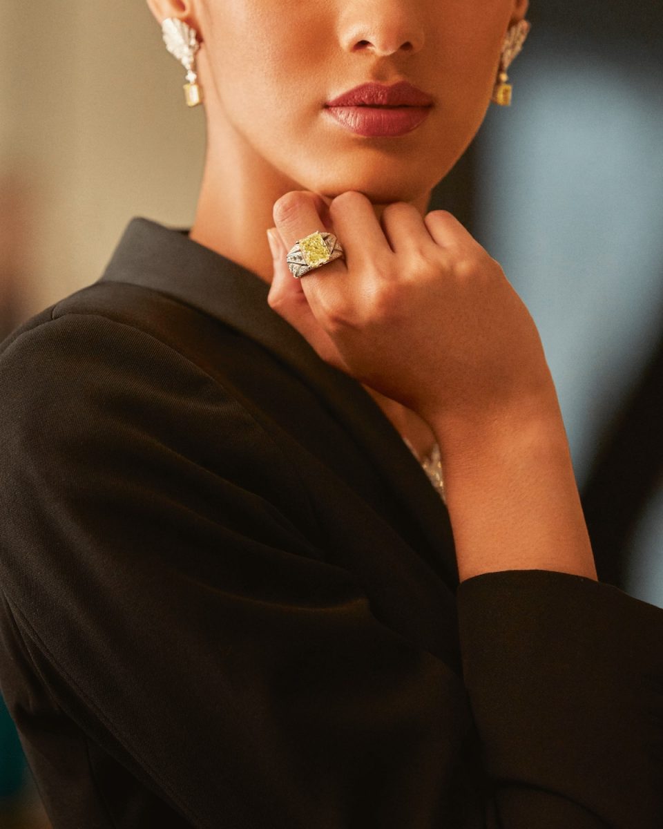 同系列中的濃彩黃鑽頂級珠寶戒指,為一枚主石達IF等級、重7.05克拉的雷地恩形切割濃彩黃鑽,克拉碩大的濃彩鑽石是大自然恩賜的禮讚,更難能可貴的呈現無螢光的飽和色澤,溫暖訴說虔誠的願望。與兩側蜿蜒鋪排的燦爛美鑽生動演繹升空中的耀眼光輝,幸福如影隨形。
