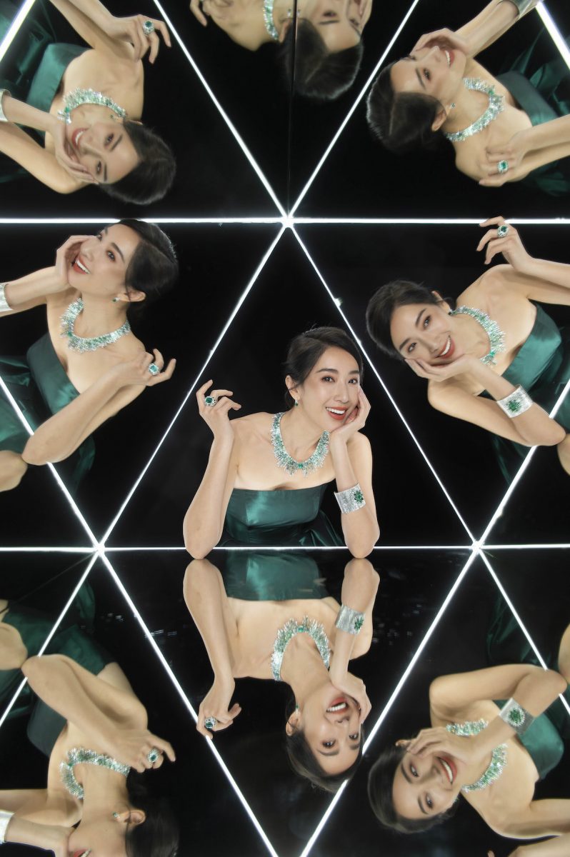 隋棠身著綠色禮服雍容華貴,輝映全身總重達28.9克拉的哥倫比亞祖母綠頂級珠寶作品,縈繞於肩頸上為一條主石為12.59克拉的哥倫比亞祖母綠頂級珠寶鑽石項鍊,伴隨著四射的長型祖母綠交錯成光彩舞動的美景。