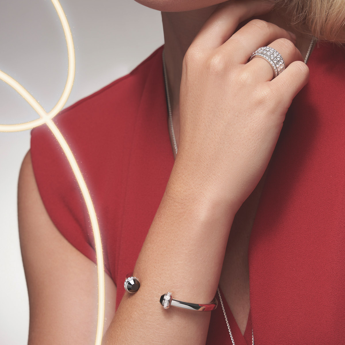 輕輕啟動旋轉魔法,Possession珠寶系列在這次Holiday Season作品中擔任實現願望的幸運仙子。作為品牌最具指標性的旋轉設計,Possession系列不斷以充滿愉悅與趣味的旋轉元素,喚醒人們最細膩的觸覺感受。今年新推出的Possession系列在設計上將經典創新融合黑白陶瓷,別出心裁的前衛外觀,簡約線條形塑伯爵當代摩登美學,在優雅格調中注入大膽設計風采,鼓勵人們展現與眾不同的自我。輕撥幸運圓環,好運悄然降臨,無論是贈禮或接收者,伯爵Possession系列都能為特殊時刻帶來前所未有的幸福感。